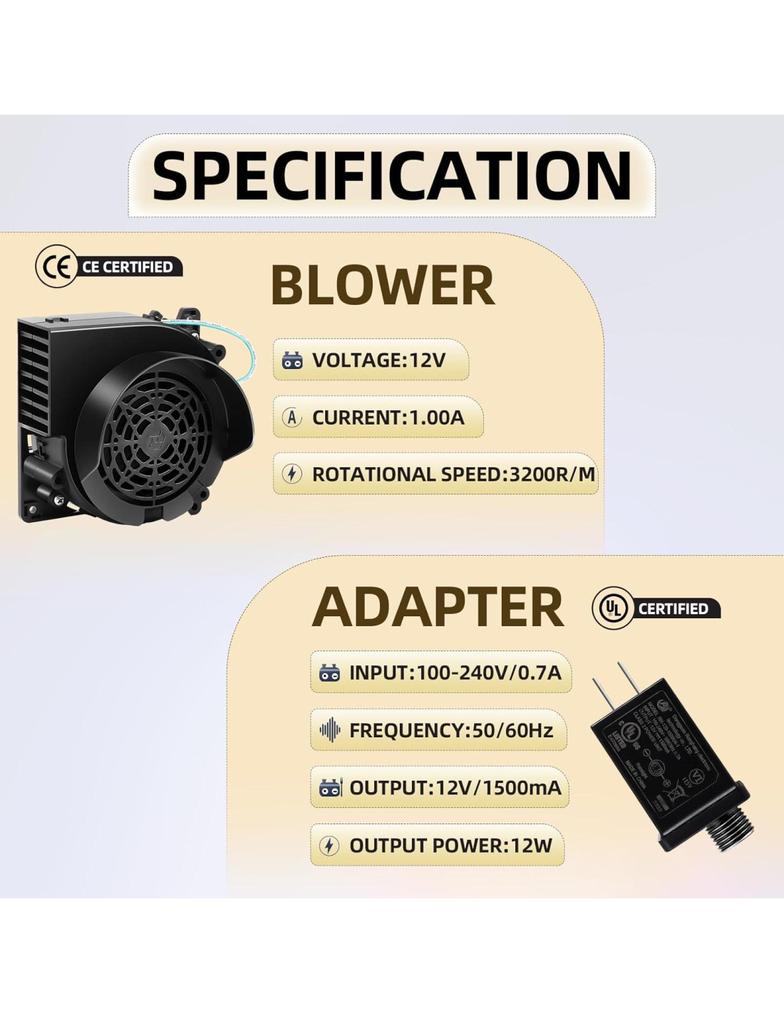 Este soplador de ventilador inflable de reemplazo con flujo de aire estable y potente y brillantes cadenas de luces puede asegurar que tus inflables se mantengan completamente inflados y se vean en su mejor momento. 1. 100-240V, 0.7A 2. : 12V, 1500 3. : 50/60HZ Adaptador de corriente certificado por UL diseñado para funcionar con la mayoría de los suministros de energía domésticos de EE. UU. Este soplador de aire está equipado con 3 cadenas de luces LED que iluminan brillantemente tanto la estructura inflable como su entorno.