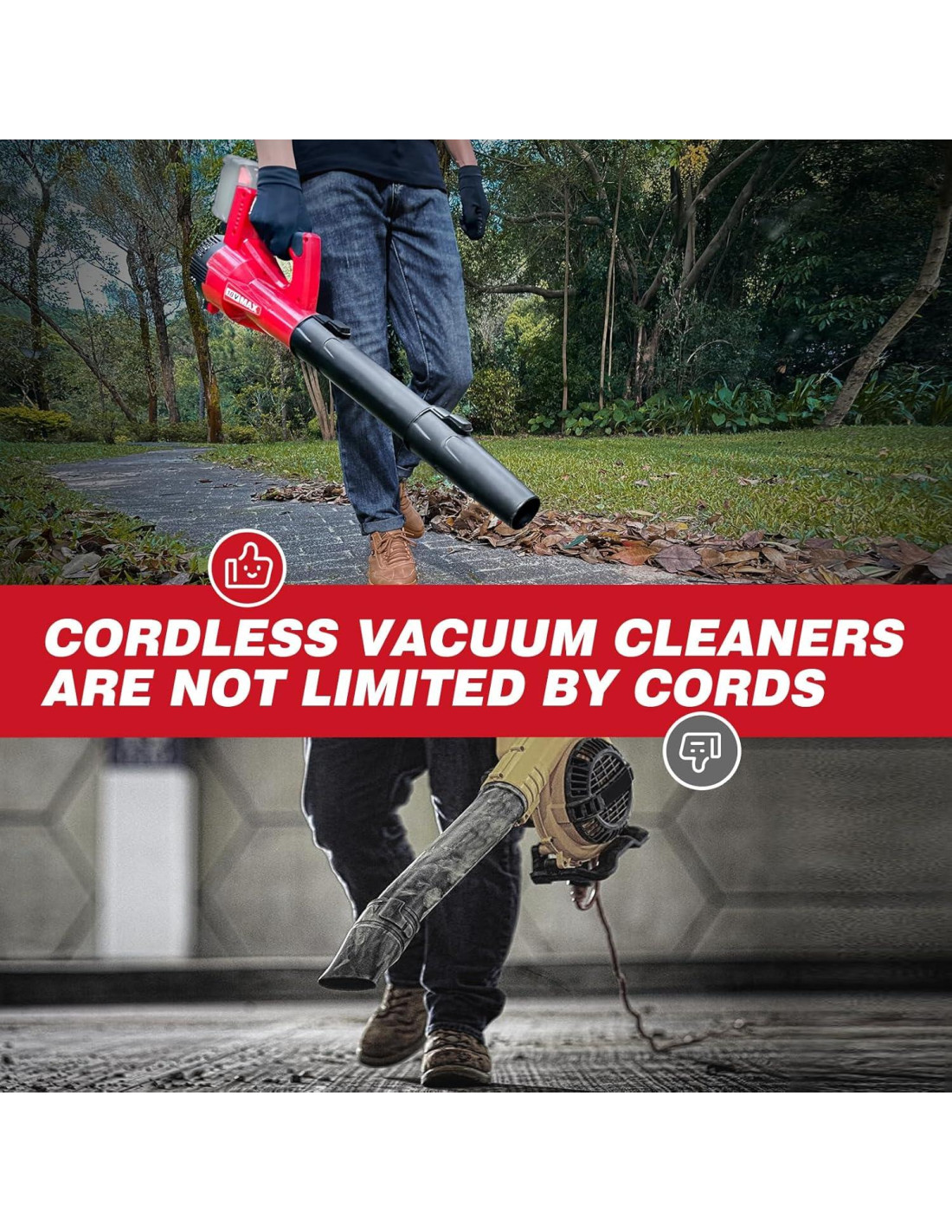 - Diseño Ligero: El Soplador de Hojas Inalámbrico no incluye baterías (solo 2.86 libras (1,30 kg)), se puede operar fácilmente con una mano, las mujeres y los ancianos también pueden usarlo fácilmente, y no se sentirán fatigados después de un largo tiempo de uso. Mango ergonómico y diseño de goma antideslizante para un agarre cómodo.