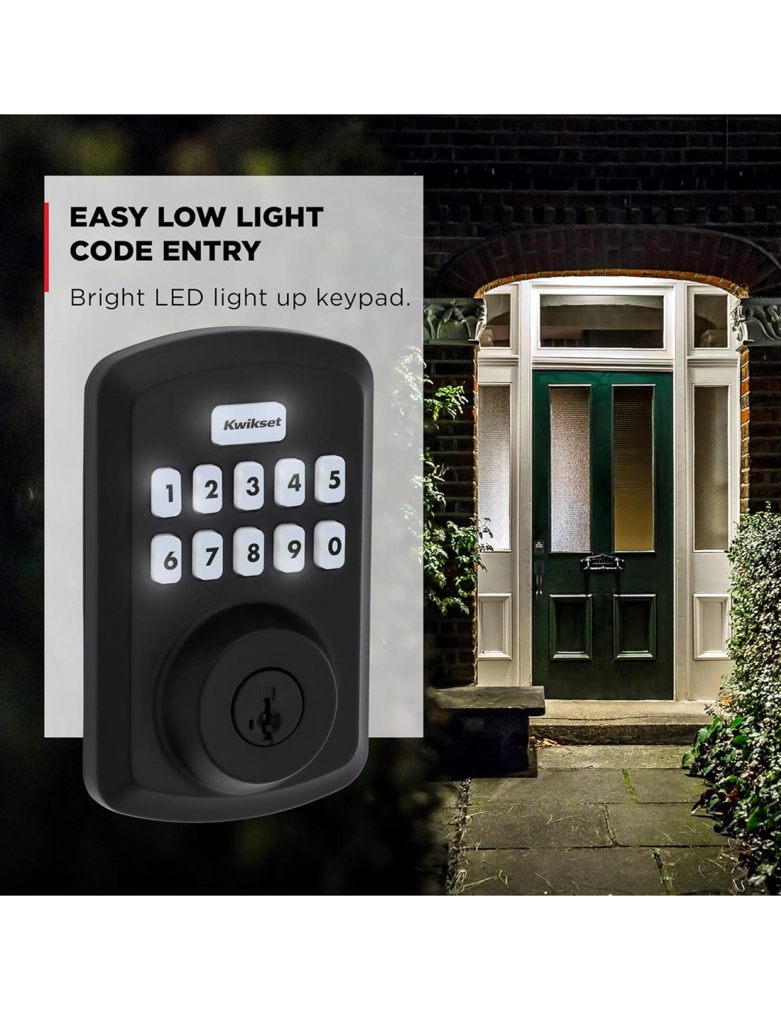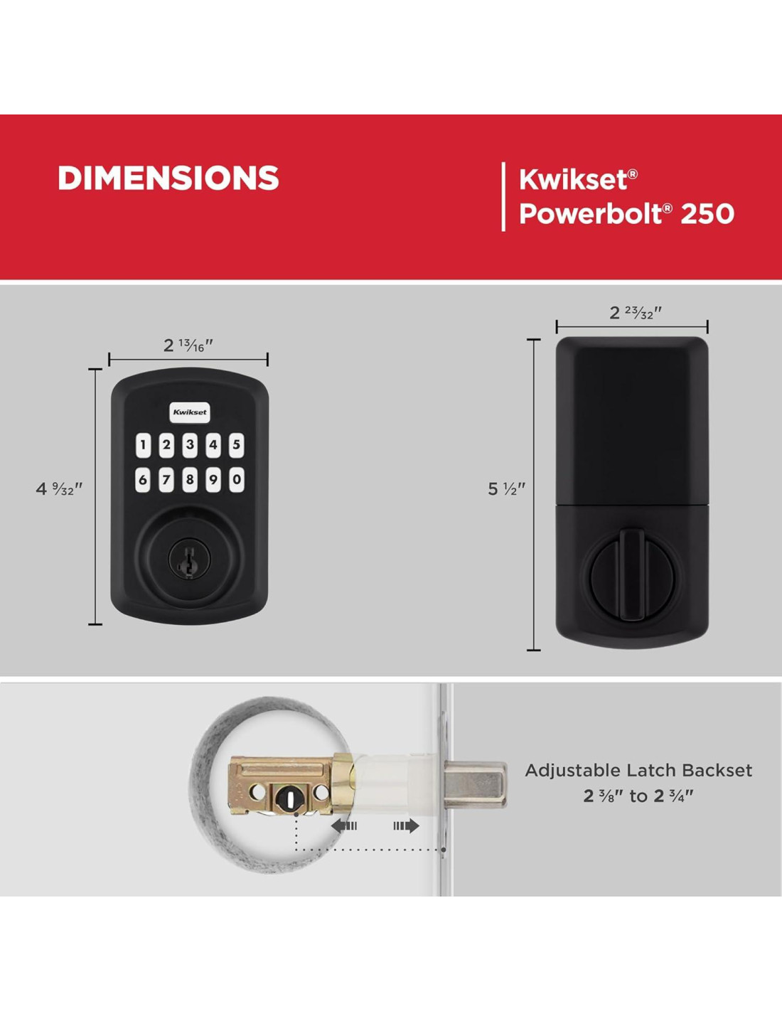 La Cerradura Electrónica Kwikset Powerbolt 250, disponible en un diseño transicional, es una forma fácil y accesible de actualizar a una cerradura electrónica. Ofrece una entrada sin llave conveniente que hace que entrar y salir sea seguro y simple. Personaliza hasta 25 códigos de usuario y disfruta de un fácil acceso al código con el teclado iluminado de 10 botones. Las características adicionales incluyen Bloqueo Automático y Modo Vacaciones, que proporcionan seguridad y tranquilidad. Todo lo que necesitas es un destornillador para instalarla.
