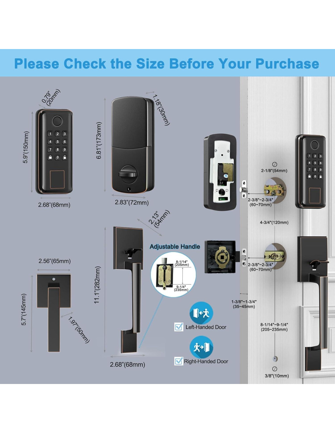 - Características especiales: Control por APP Bluetooth, Auto Bloqueo, Desbloqueo por Huella Dactilar, Teclado Anti-espiado, Control de Llave Física, Entrada Sin Llave, Bloqueo con Un Toque, Control Remoto (Necesita Gateway), Control por Voz Funciona con Alexa (Necesita Gateway)