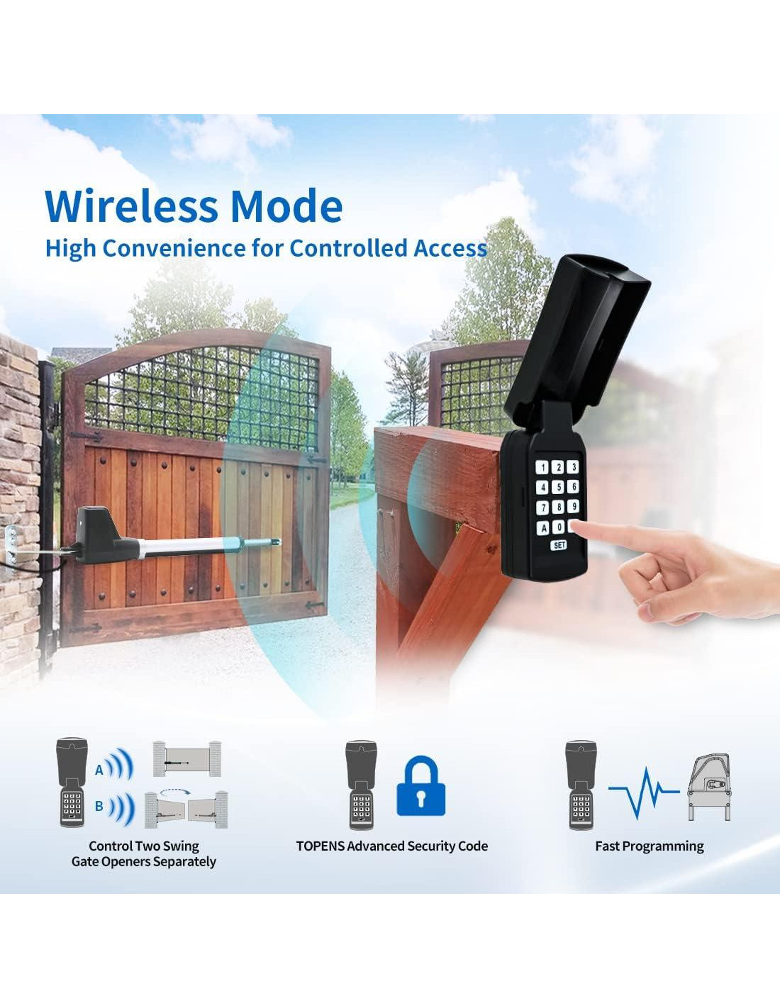 - Teclado Universal - El Teclado Universal TOPENS TC188 es un teclado de control de acceso inteligente con tecnología de código avanzada de TOPENS. Simplemente ingresa una contraseña corta para abrir la puerta sin llevar una llave. Los modos de conexión flexibles de 'con cable e inalámbrico' son para tu selección. Diseñado como un accesorio ideal para la seguridad, este teclado numérico mejora enormemente la experiencia de operación sin llave. Ofrece alta conveniencia para el acceso controlado, facilitando el acceso de los invitados a tu sistema de abridor de puerta.