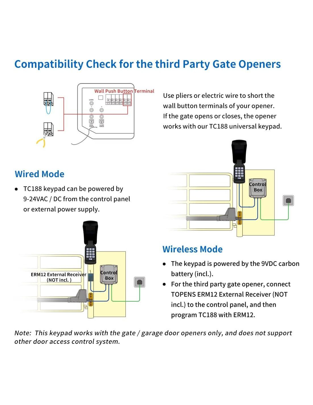 - Amplia Compatibilidad - Funciona con todos los abridores de puertas TOPENS, y es compatible con la mayoría de los abridores de puertas deslizantes / de garaje de terceros cuyo panel de control acepta la señal de 'Contacto Seco Normalmente Abierto'. El TC188 puede ser alimentado por la batería de carbono de 9VDC (incluida en el paquete), o por el panel de control del abridor de la puerta, o por una fuente de alimentación externa de 9-24VAC/DC. Ten en cuenta que este teclado solo funciona con los abridores de puertas / garajes, y no es compatible con otros sistemas de control de acceso a puertas.