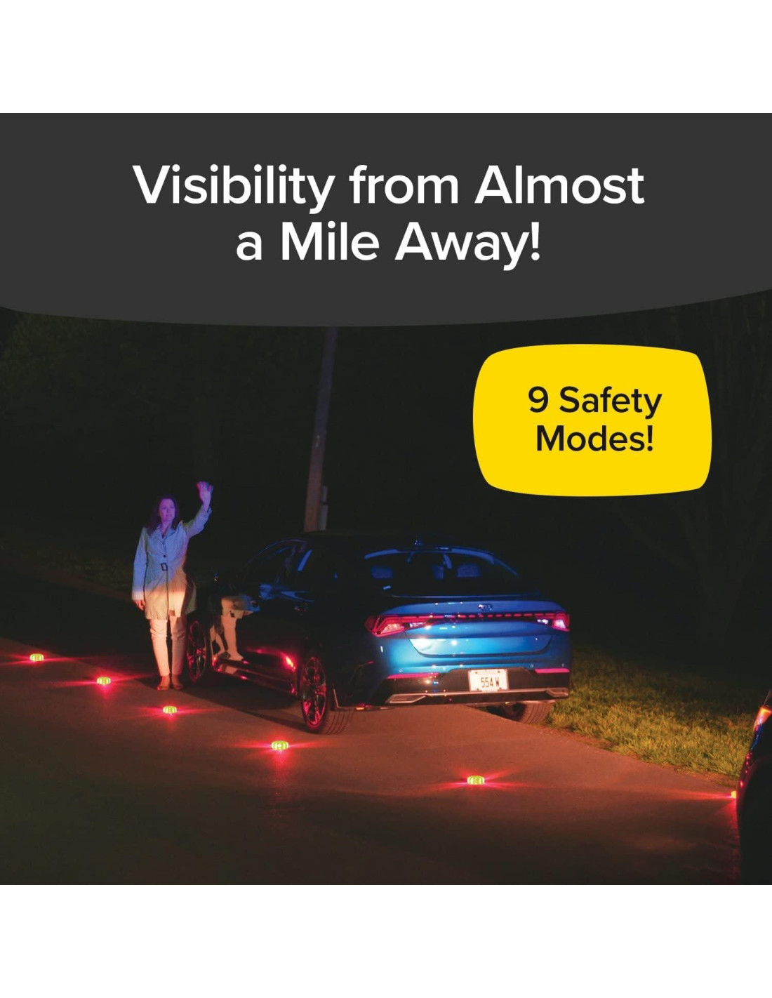 - Visibilidad de 360 grados a larga distancia: Cada bengala de carretera ofrece 360 grados de luz brillante visible desde casi una milla de distancia para asegurar visibilidad mientras esperas asistencia en la carretera; para máxima visibilidad y seguridad, coloca seis o más a lo largo del frente, lado y parte trasera de tu vehículo