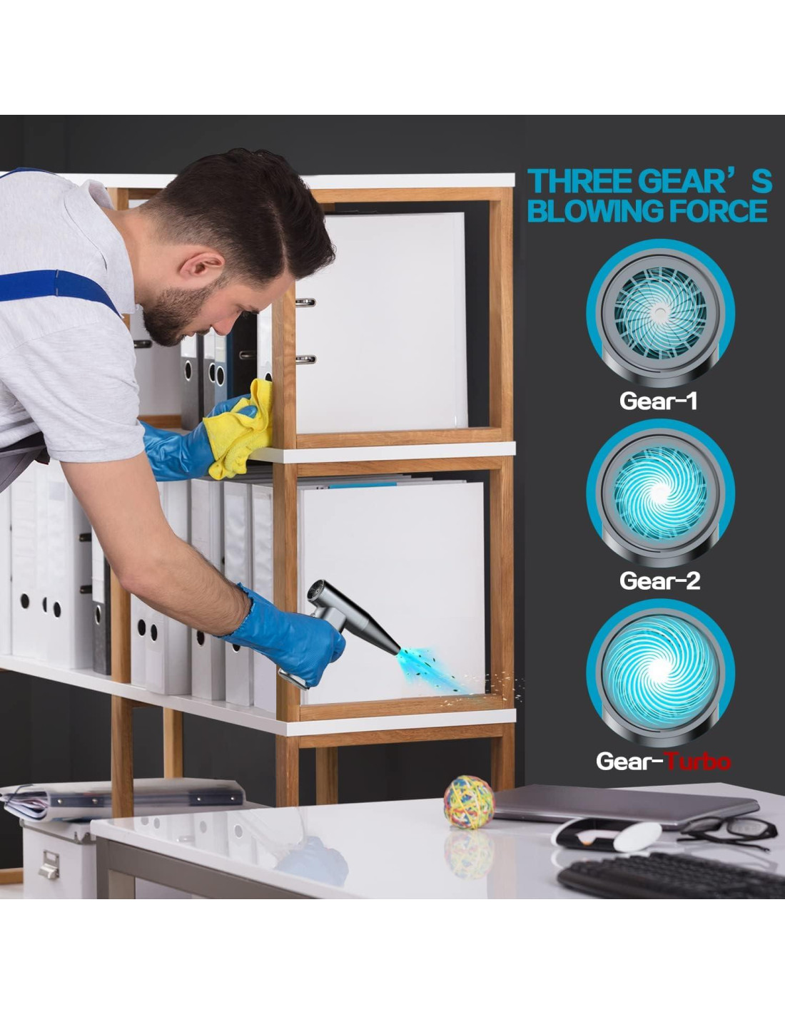 - [Motor de Alta Velocidad] Nuestro soplador de aire está impulsado por potentes motores, con una velocidad máxima de 180000RPM. Con 3 modos ajustables, proporciona una limpieza efectiva adaptada a diferentes tareas, manteniendo un rendimiento óptimo