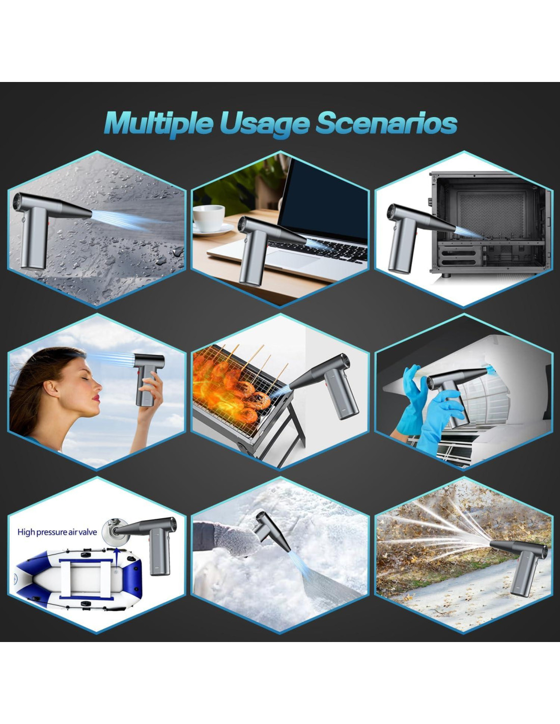 - [Multiuso] Nuestro soplador de aire es adecuado para una variedad de escenarios, como limpiar teclados, unidades centrales de PC, rejillas de aire acondicionado, migas de sofá, secado de pelo de mascotas, encendido de barbacoas, inflado, soplar nieve. También puede actuar como un ventilador