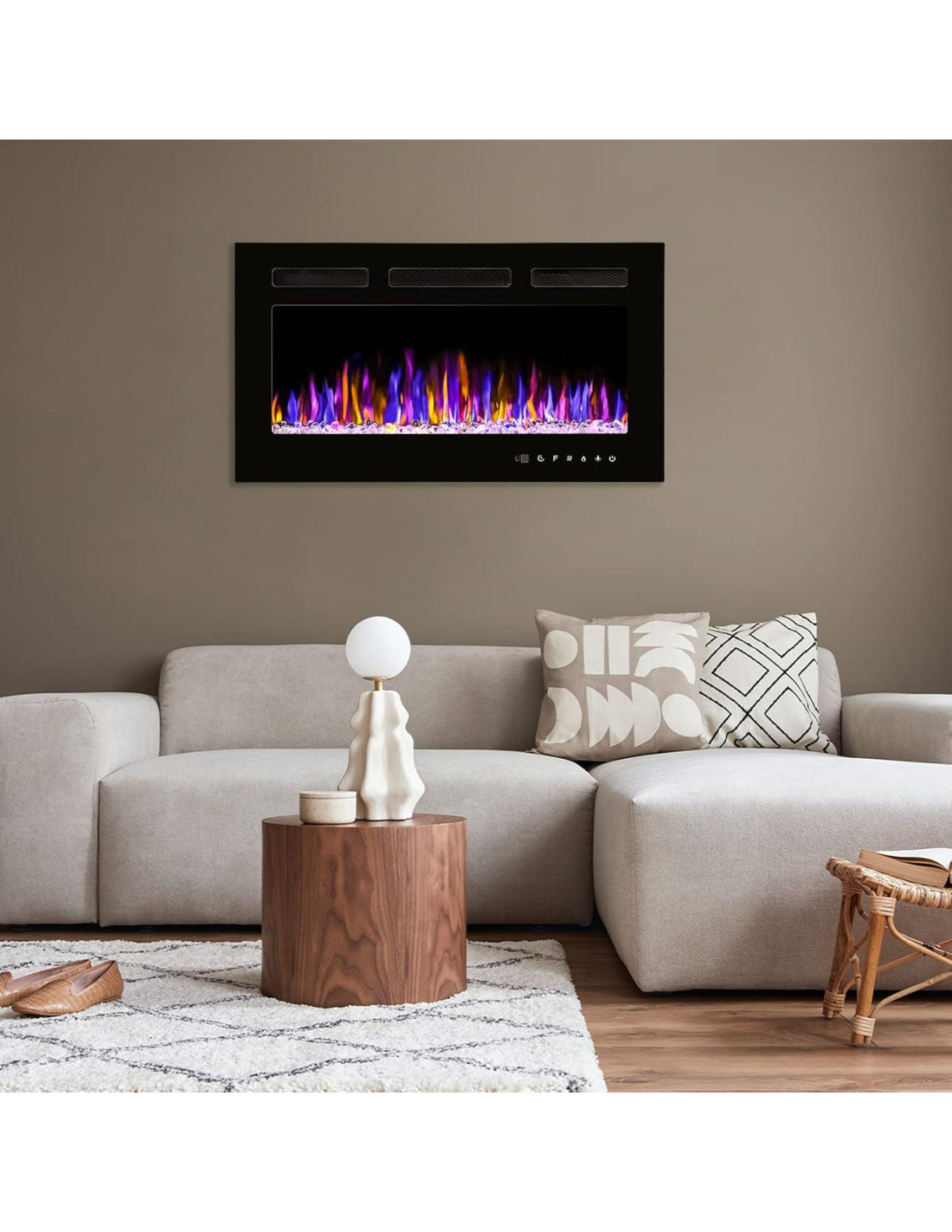 - Característica especial: Apagado Seguro, Con control de panel táctil y control remoto, Llama con 12 colores LED cambiables, Opciones de troncos de carbón y piedras de cristal, Temperatura y temporizador ajustables