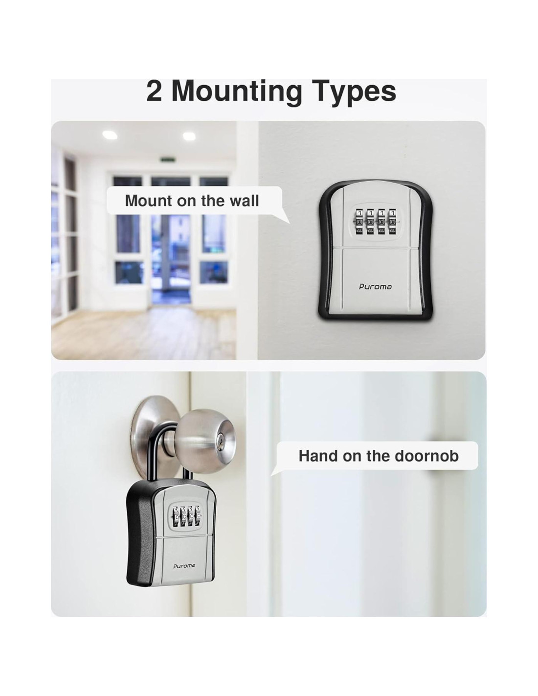tu compañero en protección. Nuestro compromiso de mejorar tu seguridad se hace realidad a través de una variedad de soluciones impactantes: cerraduras de combinación, cerraduras de llave, cerraduras TSA, cajas de seguridad portátiles y más. Dondequiera que la vida te lleve, confía en Puroma para mantener tu hogar, pertenencias y viajes seguros. Puroma, Protectores de lo que Amas. Fácil de Usar: Esta caja de cerradura viene con un grillete de cerradura removible, puedes asegurarla alrededor del pomo de la puerta. Hay suficiente capacidad para poner la llave extra de tu casa en ella. Adecuada para entrada de emergencia cuando sales por negocios o de vacaciones. Fácil de Instalar: Esta caja de cerradura se puede montar en una pared con tornillos y tapones de expansión (incluidos en el paquete). Conveniente para que escondas llaves de repuesto alrededor de la casa o la oficina para emergencias. Perfecta para bienes raíces y gestión de propiedades. Fácil de programar con cualquier código de 4 dígitos que desees. No necesitas preocuparte por un extraño encontrando tu llave y accediendo a tu casa. Hecha de material premium. Adecuada para uso en interiores o exteriores. Aplicable a entradas de apartamentos, garajes, casas de alquiler, casas de vacaciones, etc. Viene con un grillete de cerradura de acero reforzado y duradero. El cuerpo de la cerradura de aleación de aluminio previene que la caja de cerradura sea golpeada, serruchada o forzada. Cuando se monta en la pared, se pueden usar 2 tapones de goma negros incluidos para prevenir que el polvo o el agua entren y extender la vida útil.