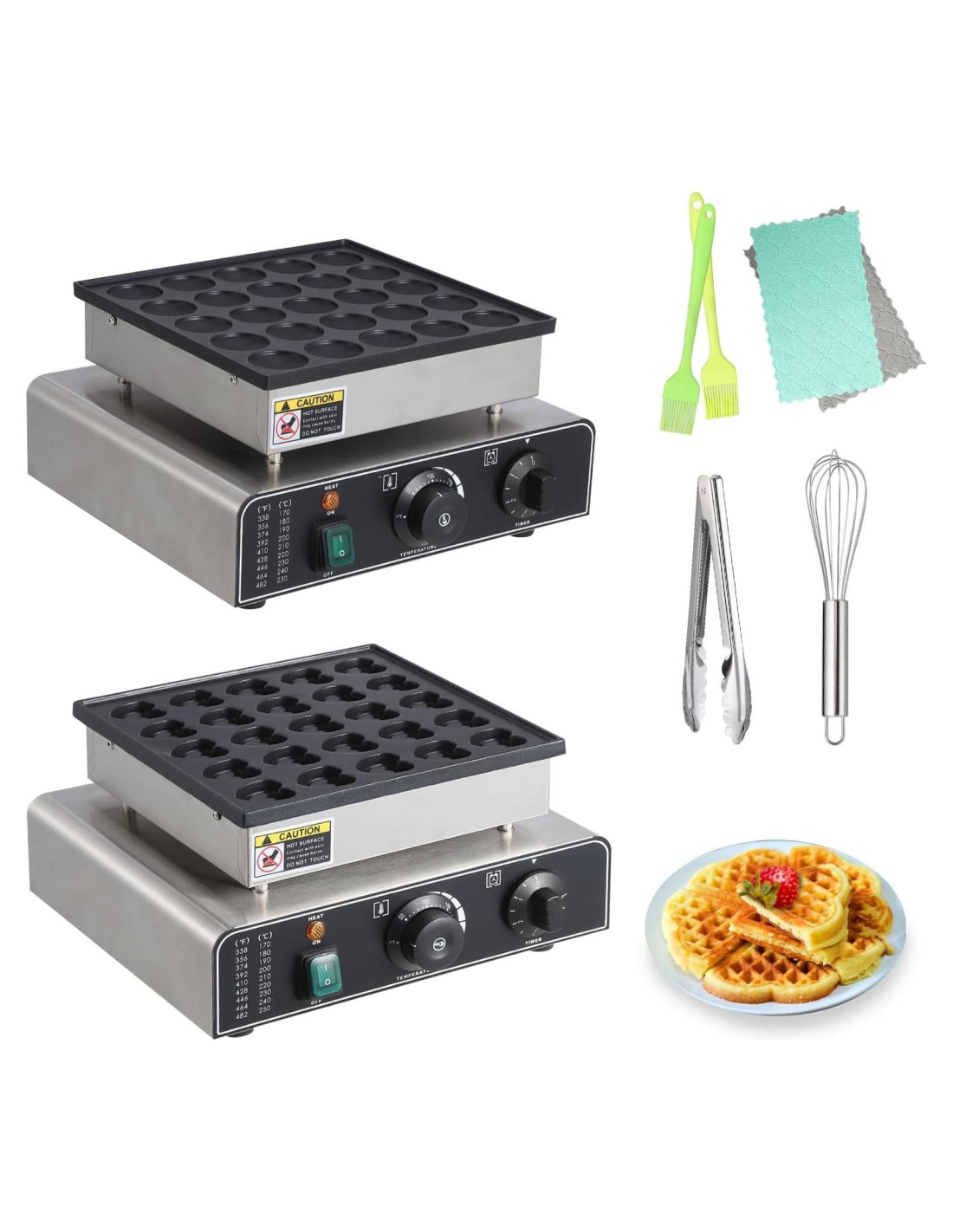Hecho de un cuerpo de acero inoxidable de grado alimenticio, que es a prueba de óxido y a prueba de corrosión. Fácil de desmoldar, duradero, resistente a la corrosión, resistente a altas temperaturas y tiene una vida útil más larga. La superficie antiadherente es fácil de limpiar. Utiliza un tubo de calefacción en forma de anillo que puede calentarse rápidamente en poco tiempo, distribuyendo el calor de manera uniforme. Hace 25 pancakes holandeses o waffles en solo 3-5 minutos. El rango del botón de tiempo de la máquina de muffins es de 0-5 min, y el rango del botón de control de temperatura es de 50~300C (122-572F).