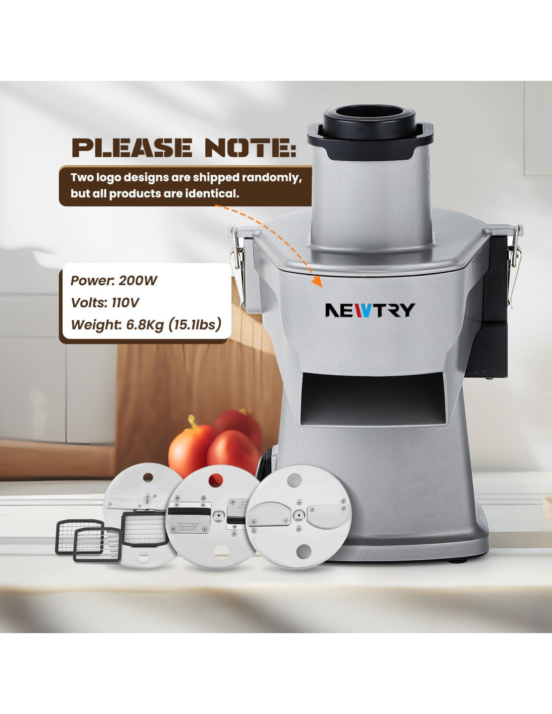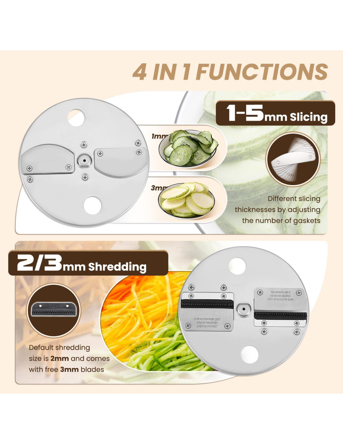- Tamaño de Corte Multifuncional -- Corte en Dados: 8*8mm y 10*10mm; Corte en Rodajas: 1-5mm; Rallado: 2 y 3mm; Corte en Tiras: 10mm.