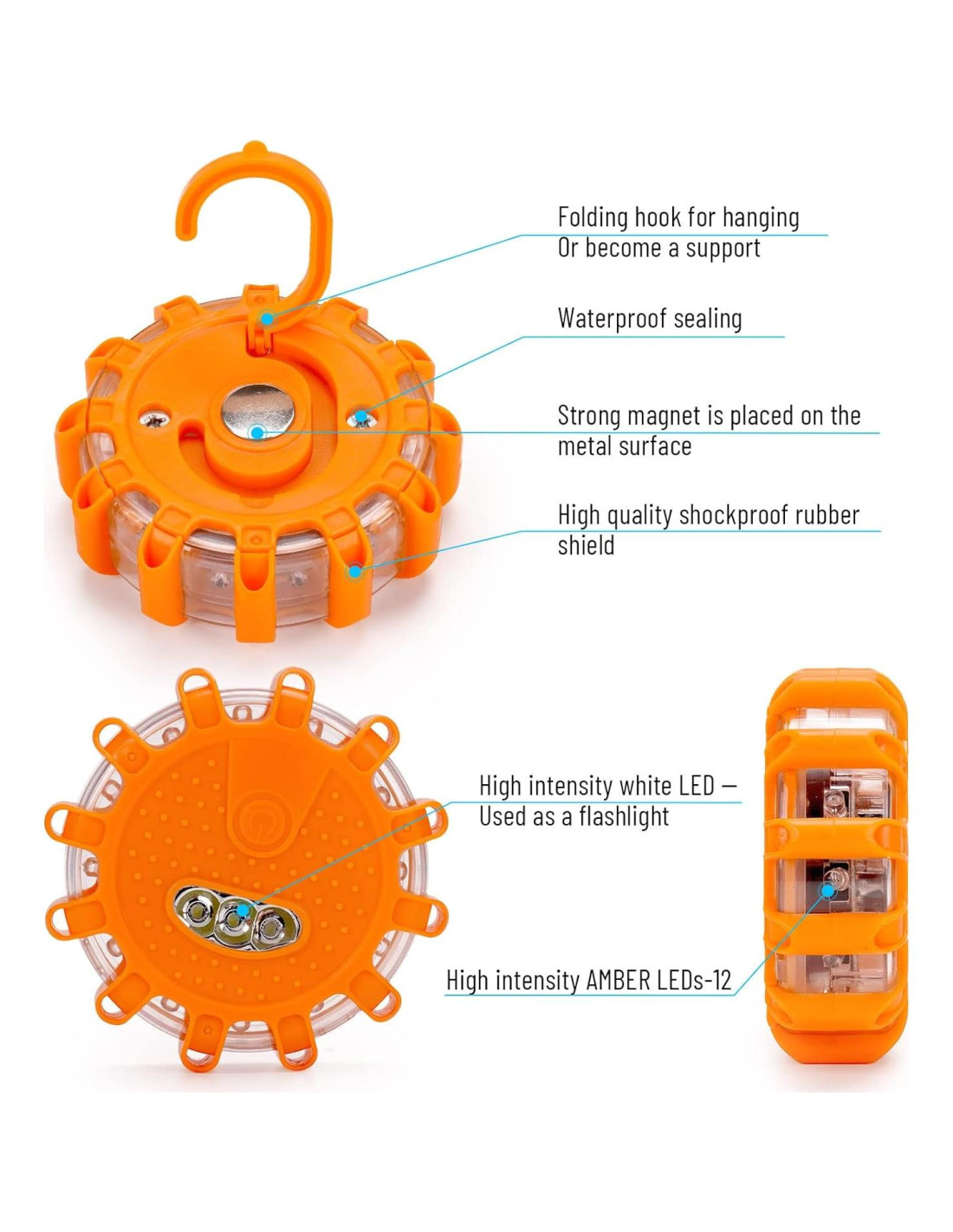 - [Gancho y base magnetizada fuerte] Las luces de advertencia están equipadas con un fuerte imán de succión para fijarse al techo y la parte trasera del vehículo, y también se pueden colocar en el suelo para advertencia. Un gancho fuerte se puede adjuntar a otros vehículos como bicicletas y motocicletas.