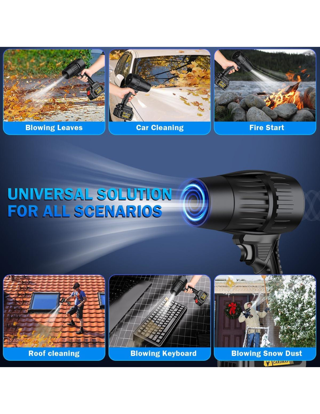 - [Uso Amplio] El soplador de hojas eléctrico de mano no solo se utiliza para soplar hojas, puede funcionar de manera diferente según tus diferentes necesidades, como trabajar en el garaje, patio, porche, acera, automóvil, balcón.