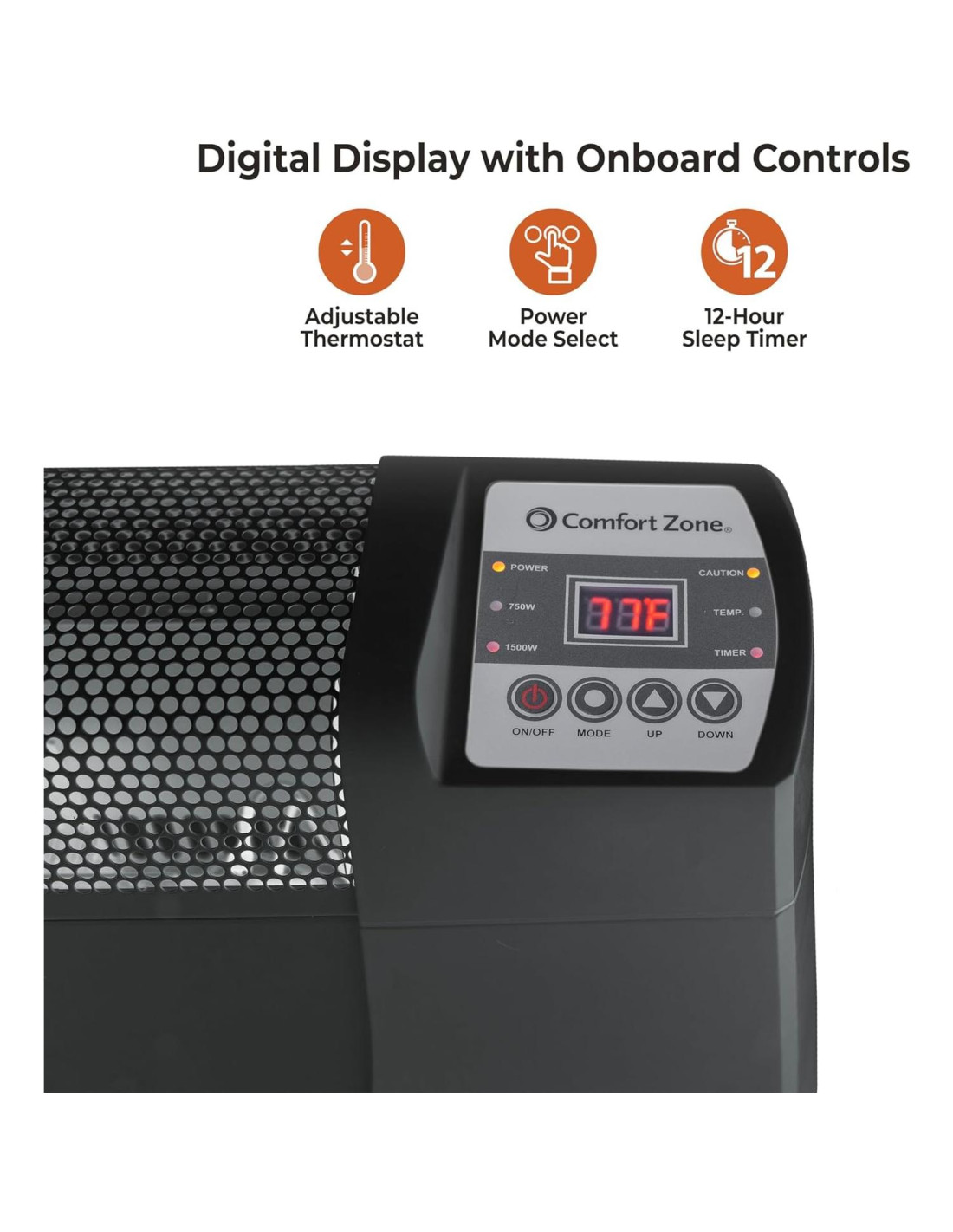 Potencia calefactor de 1500 vatios. Hay mucha potencia en este calefactor de zócalo digital gracias a sus 1500 vatios, por lo que puedes estar seguro de que te calentarás en poco tiempo. El calefactor por convección cuenta con dos configuraciones de calor y un termostato digital ajustable con pantalla de temperatura, por lo que tendrás el nivel de control que necesitas para la temperatura precisa que deseas. Operación silenciosa en un diseño elegante. El calefactor de zócalo eléctrico ofrece operación silenciosa para asegurar que nadie sea perturbado. Lee un libro, mira televisión o charla sin ser distraído por ruidos de fondo irritantes. El calefactor negro de perfil bajo cuenta con paneles de extremo a prueba de abolladuras para durabilidad, por lo que la unidad lucirá elegante durante años. Seguridad primero. Un sistema de seguridad avanzado proporciona tranquilidad adicional, especialmente si tienes mascotas o niños en casa. El sistema incluye un interruptor de vuelco de seguridad que corta la energía si tu calefactor se cae accidentalmente, un cuerpo que se mantiene fresco y un sensor de protección contra sobrecalentamiento que evita que se caliente demasiado. Reduce los costos de calefacción. Si buscas una manera de ahorrar en las facturas de calefacción del hogar, no busques más que este calefactor de zócalo eléctrico con termostato. Te permite mantener la habitación en la que estás a un nivel cálido y cómodo mientras reduces el calor en el resto de tu hogar, particularmente en áreas no utilizadas.