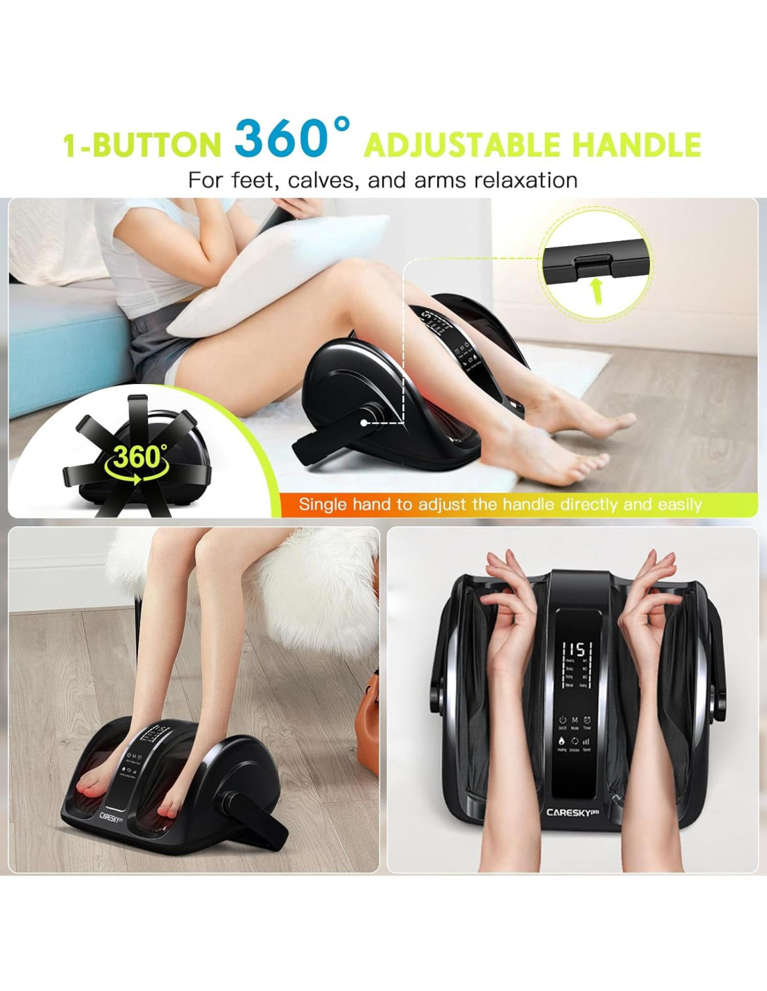 - Mango ajustable 360 con un botón - Con un mango ajustable de una mano a 360, puedes masajear tus pies, pantorrillas y manos libremente en diferentes posiciones del cuerpo. La regla del control remoto lo hace más conveniente de usar. Y la pantalla completa mejorada es más impactante y sorprendente.