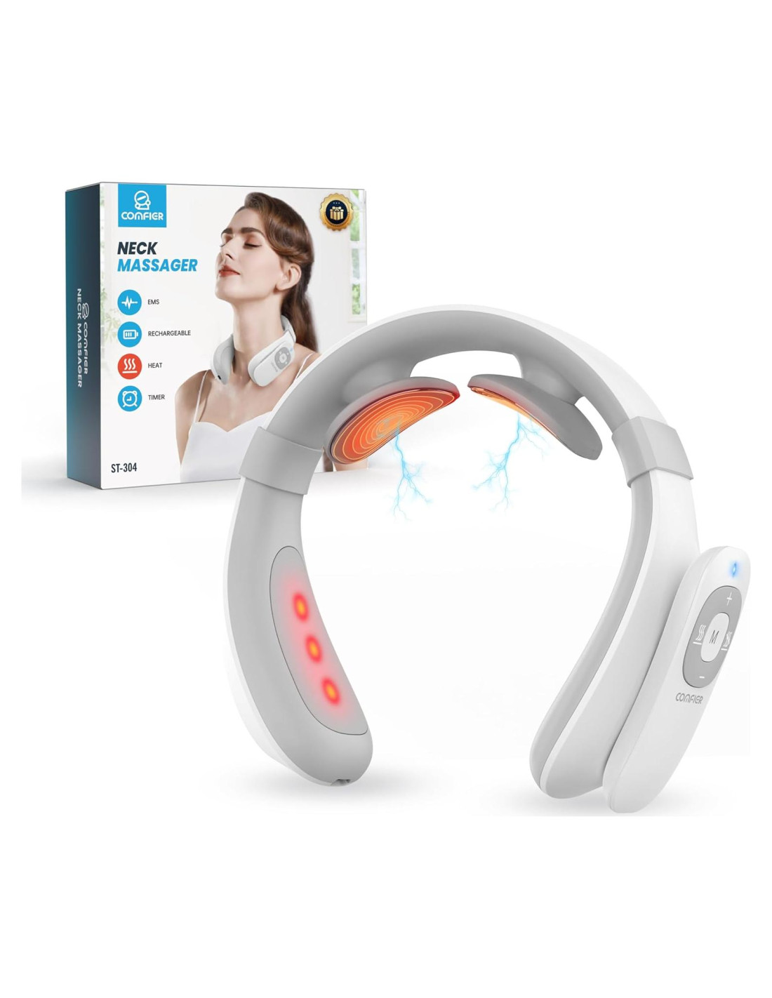 - Los electrodos del cuello proporcionan a los usuarios estimulación en la parte posterior del cuello y calor para calentar y confortar los músculos de la parte posterior del cuello. La unidad principal proporciona acceso para ajustar la intensidad hacia arriba o hacia abajo y ajustar el modo de estimulación, encender/apagar la unidad principal y la función de calefacción.