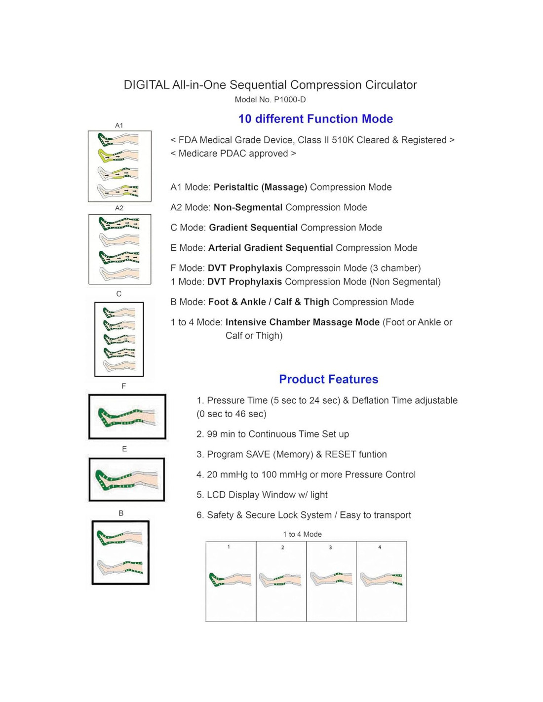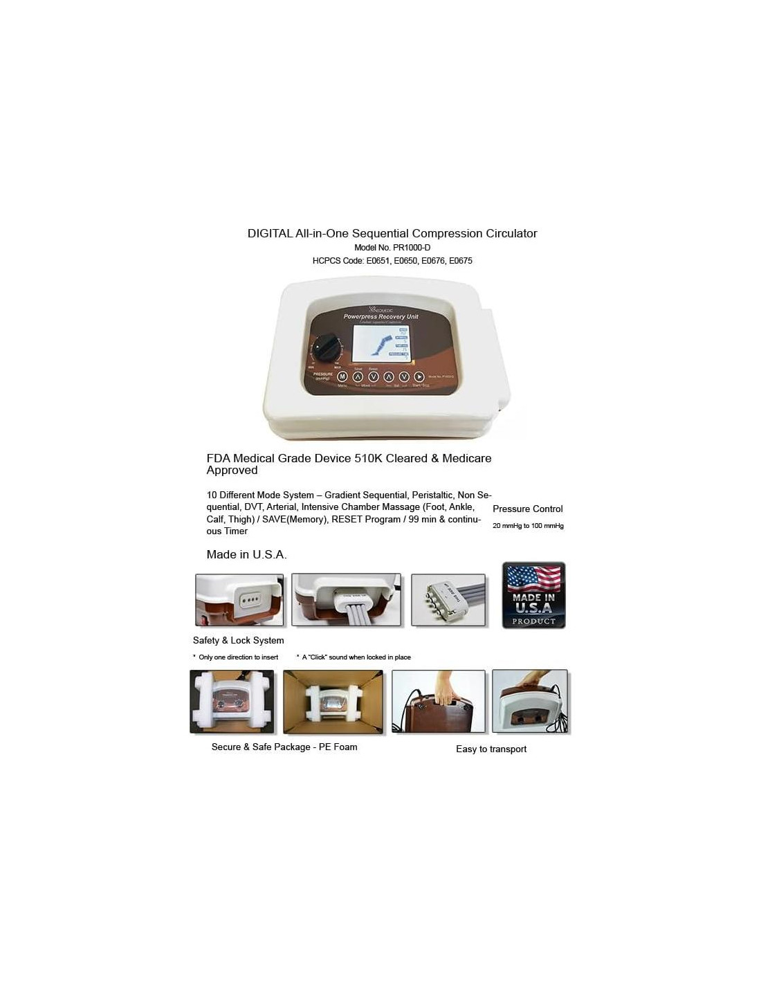 Aprobado por la FDA 510(k) para venta libre / Fabricado en EE. UU. Sistema de 10 Modos Diferentes / Masaje Intensivo en Cámaras (Pie, Tobillo, Pantorrilla, Muslo) / Inflación (5-24 seg) y Desinflación (0-45 seg) ajustable / Presión 20 - 100 mmHg o más / GUARDAR (Memoria), REINICIAR Programa / Temporizador de 99 min y continuo PRIMERA PRUEBA DE PRENDA / Pantalla LCD / Conector Rápido y Fácil de usar con Sistema de Bloqueo de Seguridad / Máquina de 220-240v disponible con Adaptador Múltiple GRATIS