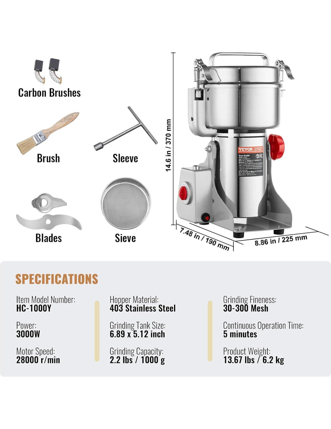 Especificaciones Número de Modelo del Artículo: HC-1000Y Potencia: 3000W Velocidad del Motor: 28000 r/min Material del Embudo: Acero Inoxidable 403 Tamaño del Tanque de Molienda: 6.89 x 5.12 pulgadas (17.5 x 13 cm) Capacidad de Molienda: 2.2 lbs (1000 g) Finura de Molienda: 30-300 Malla Tiempo de Operación Continua: 5 minutos Peso del Producto: 13.67 lbs (6.2 kg) Tamaño del Producto (L x W x H): 8.86 x 7.48 x 14.6 pulgadas (225 x 190 x 370 mm) Contenido del Paquete 1 x Molinillo de Granos Eléctrico 1 x Juego de Cepillos de Carbón 1 x Cepillo 1 x Tamiz 1 x Juego de Cuchillas 1 x Manga 1 x Manual de Instrucciones