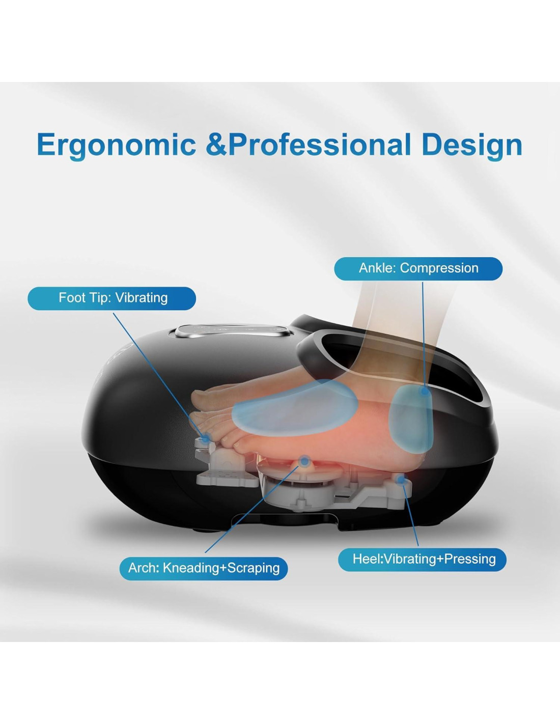 - Masaje de compresión: el masajeador de pies Comfier proporciona un masaje de compresión con 3 niveles ajustables en el empeine, el talón y los tobillos, que se pueden combinar con funciones de amasado y calor. Se recomienda comenzar con una baja intensidad para el primer uso para evitar cualquier incomodidad. Después de probar algunos masajes, la incomodidad en sus pies disminuirá y se sentirá mejor. Masajeador de pies Elegible para FSA
