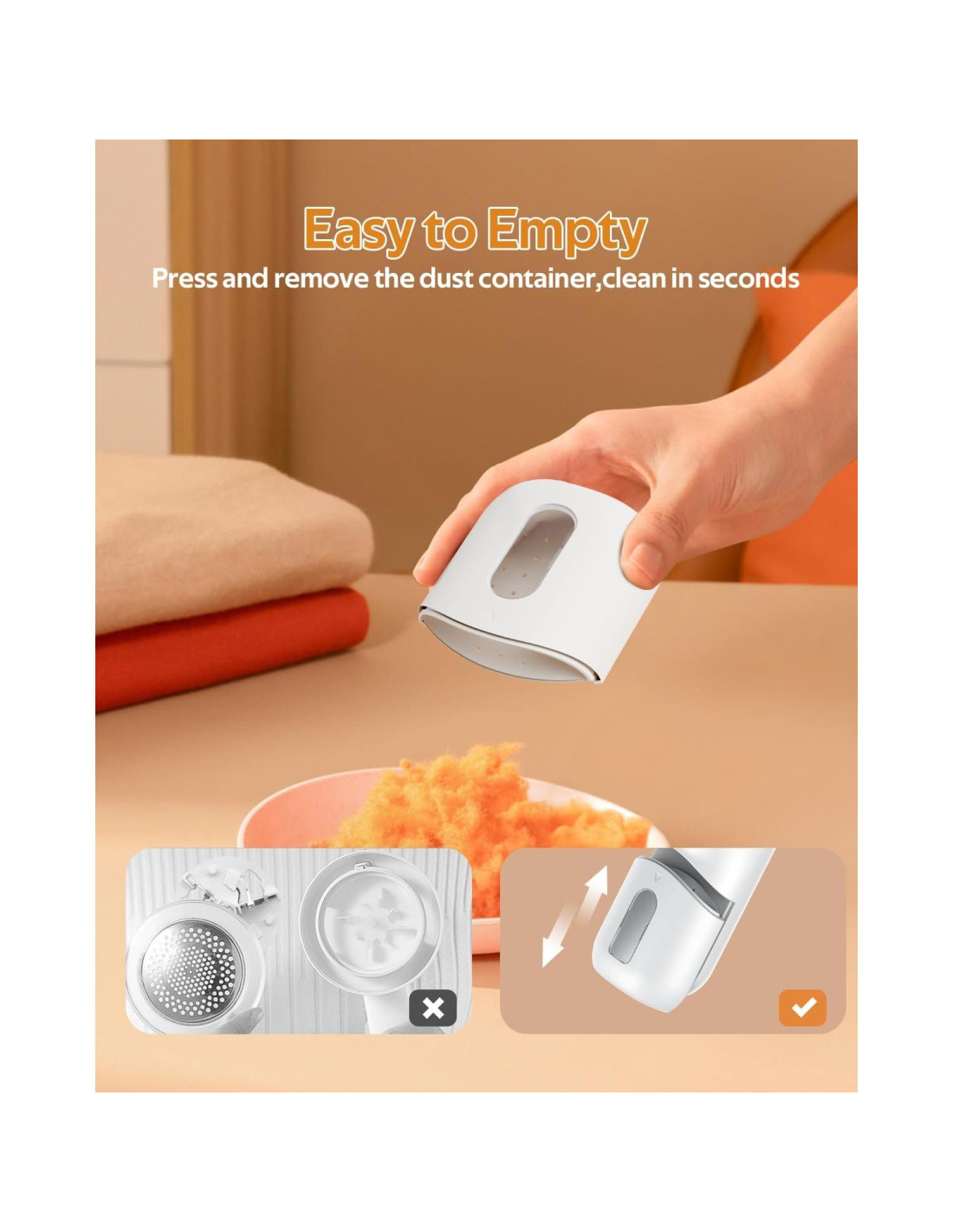 - Recolección de pelusa removible: el recolector de pelusa removible permite una limpieza rápida. No es necesario abrir la cubierta de malla y quitar la cuchilla para vaciar la pelusa como en los modelos tradicionales. La ventana visible te permite saber cuándo vaciar el contenedor de pelusa, asegurando un mejor efecto de recorte