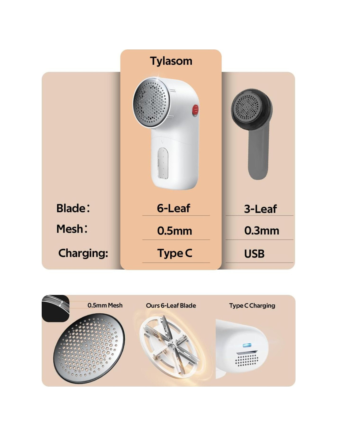- Cuchilla flotante de 6 hojas: viene con una cuchilla flotante de 6 hojas, esta afeitadora de suéter puede ajustar automáticamente la distancia a la tela, evitando cortar las prendas delicadas. La malla de panal más gruesa de 0.5mm es más duradera que la original de 0.3mm, no se deformará durante el uso; los agujeros de afeitado de 3 tamaños son adecuados para diferentes tipos de tela y tamaños de bultos