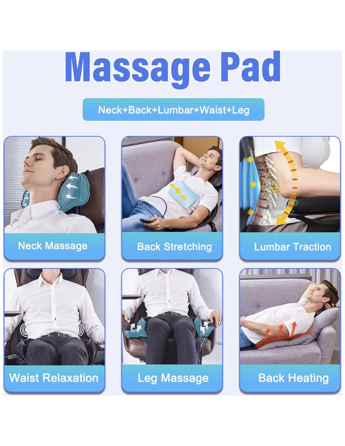 - [Almohadilla de Masaje Calentada para la Espalda Completa] Esta almohadilla masajeadora para silla cuenta con bolsas de masaje de múltiples capas y dos nodos vibratorios, ofreciendo funciones de masaje integrales. Este masajeador apunta efectivamente al cuello, la espalda, las caderas y los muslos, proporcionando presión y tracción reconfortantes. Además, la tracción en la espalda moviliza suavemente tu columna vertebral, y la almohadilla calefactora incorporada ayuda a reducir la presión en tu columna causada por estar sentado prolongadamente o trabajar en la oficina. (Por favor, nota: El control remoto se almacena en la bolsa de almacenamiento abierta en el lado derecho del asiento del cojín.)