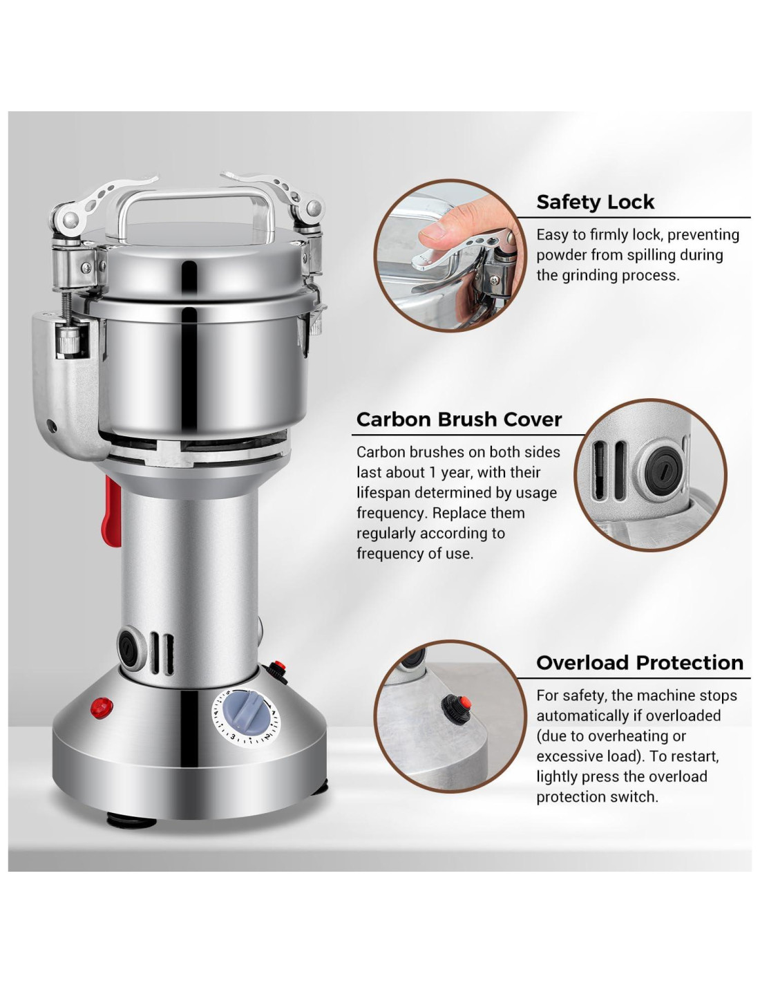 - SUPER SEGURO: Hecho de acero inoxidable de grado alimenticio para durabilidad y resistencia. El molinillo se apaga automáticamente cuando está sobrecargado por seguridad, y se puede reiniciar presionando el botón rojo. El tiempo de uso recomendado no es superior a 3 minutos, con un período de descanso de 5-10 minutos después de cada sesión de molienda.
