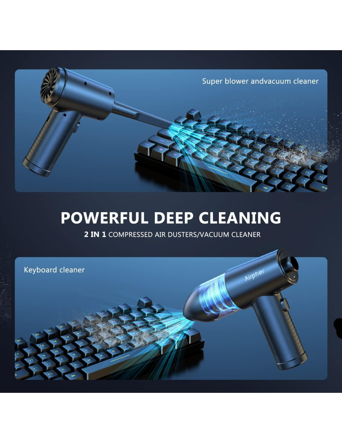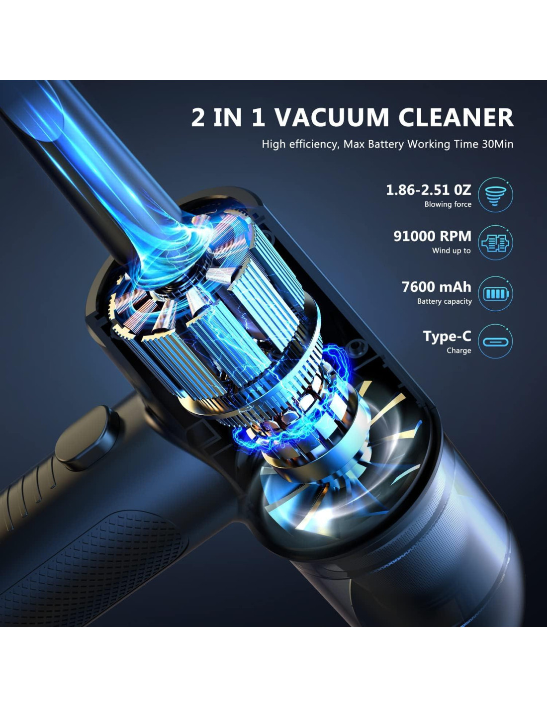 - Potente soplador de aire y aspiradora 2 en 1. Con la potencia del soplador de aire inalámbrico puede alcanzar 900000RPM. Crea un flujo de aire concentrado y superfuerte para eliminar escombros y polvo de cualquier rincón, ofrece una limpieza eficiente que dejará su hogar u oficina impecable.