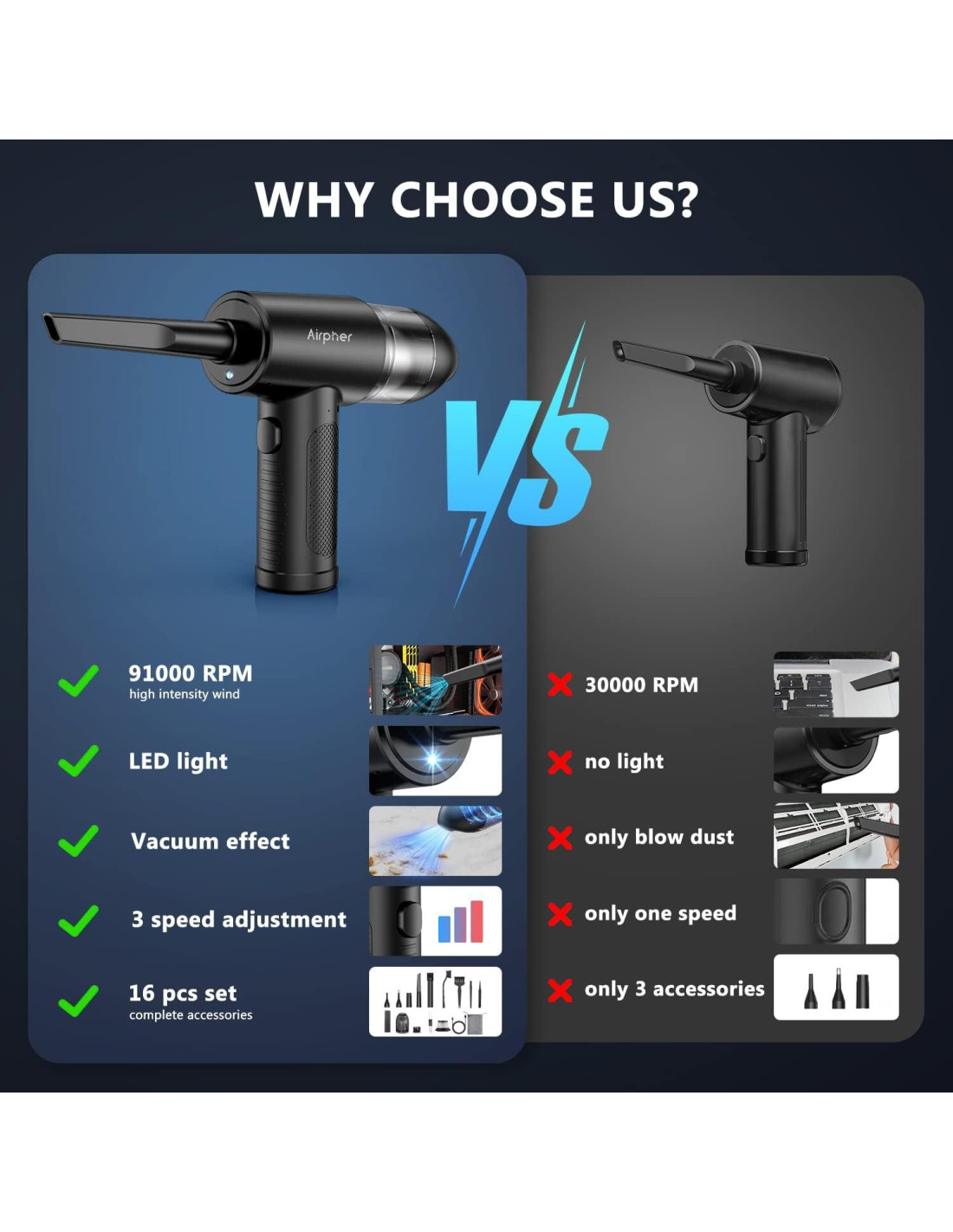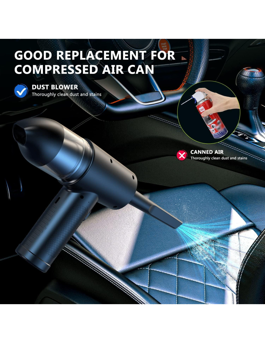 - 3 velocidades, 12 boquillas y cepillo, luces LED. El soplador de aire tiene tres velocidades de viento y viene con más de 10 boquillas y un cepillo que facilitan la limpieza de cualquier rincón en el hogar u oficina. Diferentes sitios de limpieza, reemplace los accesorios apropiados, con viento fuerte, la limpieza es más fácil. También tiene luces LED para ayudarle a ver y limpiar en espacios oscuros.