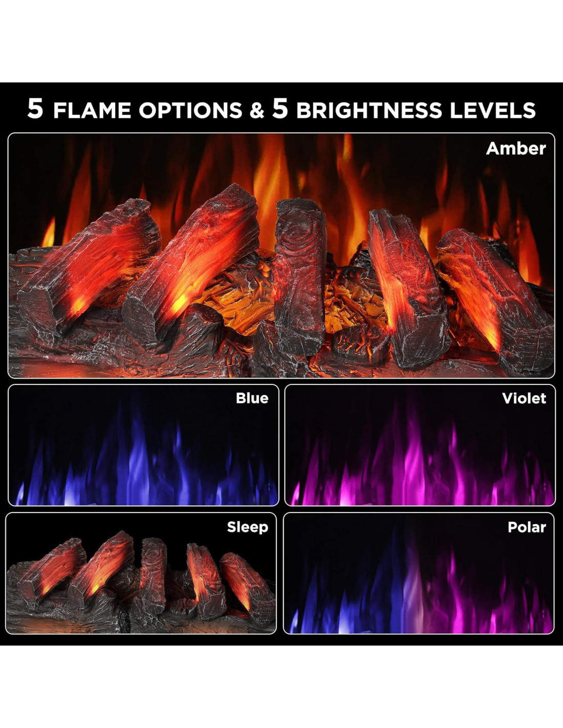 - Múltiples Efectos de Llama: A diferencia de otros simples conjuntos de troncos eléctricos, el EF30-PB proporciona 5 opciones de llama y 5 niveles de brillo para adaptarse a cualquier ocasión. El modo único "Dormir" ilumina suavemente la cama de brasas sin una llama brillante y parpadeante que pueda perturbar tu sueño