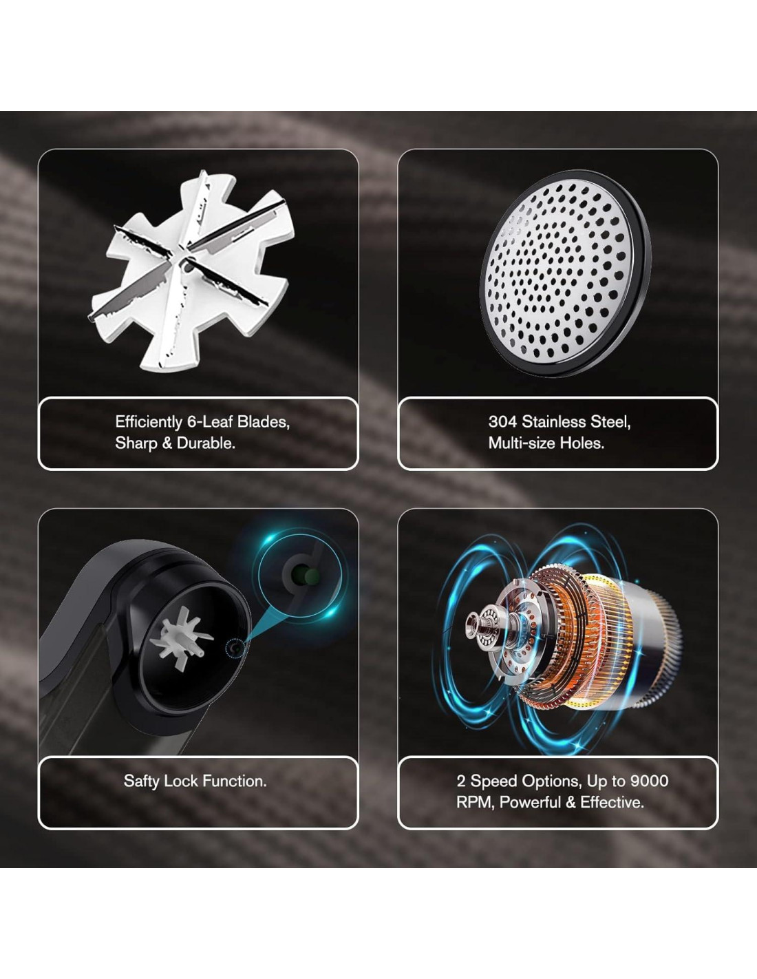 - Diseño innovador y duradero Nuestro raspador de pelusa cuenta con un diseño de mango ergonómico que te hace sentir más conveniente y cómodo al operarlo. Puedes ver visualmente el nivel de energía a través de la pantalla LED. Con una caja de recolección de pelusa de mayor capacidad, no necesitas preocuparte de que el removedor de tela no funcione correctamente debido al retroceso de polvo de pelusa y obstrucciones. La carcasa de ABS de alta calidad y las cuchillas de acero inoxidable 304 son suficientes para usar durante muchos años.