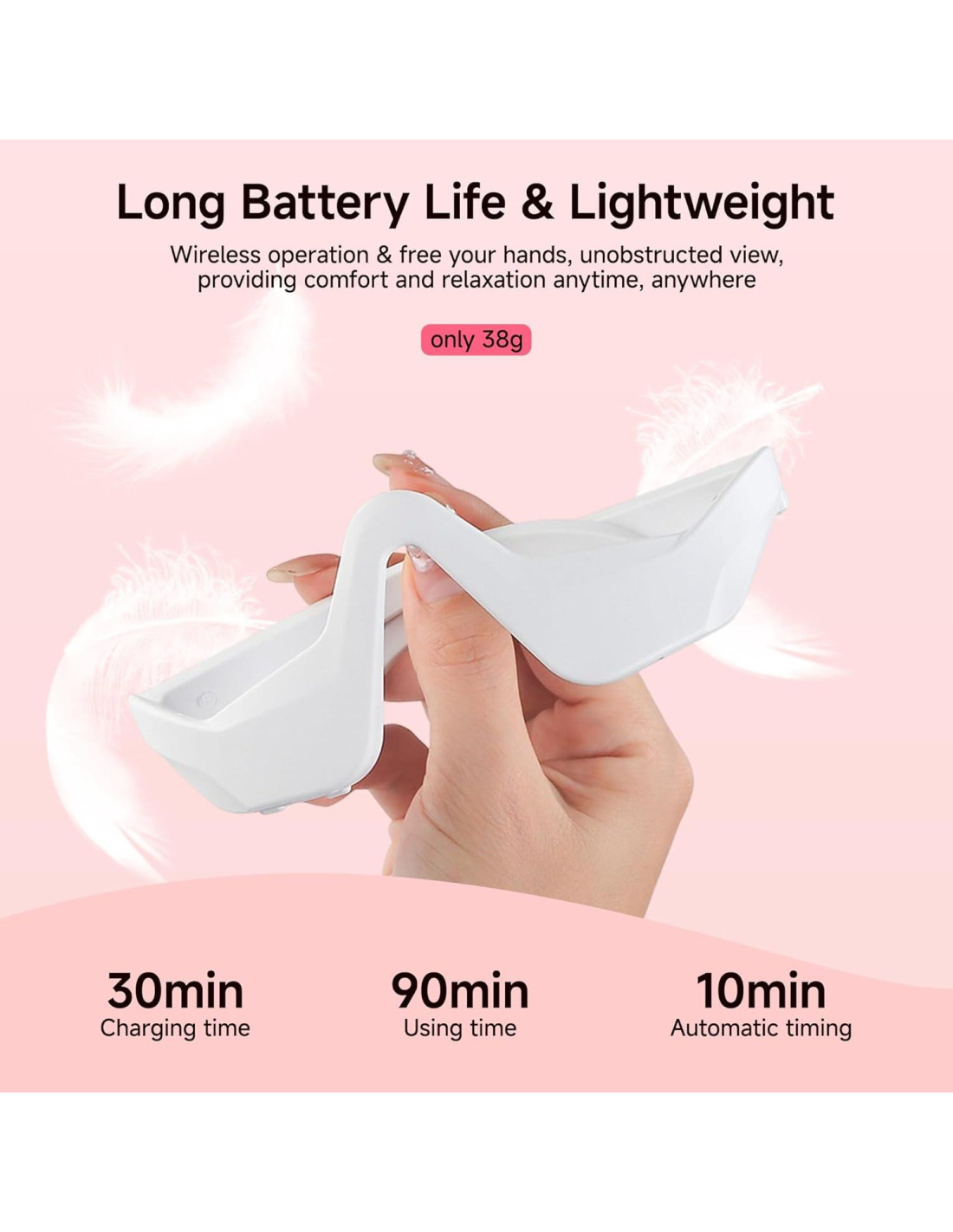 - Diseño ergonómico: El diseño ergonómico en 3D se adapta a los contornos de tus ojos para una entrega uniforme de luz. Úsalo mientras trabajas, lees o te relajas.