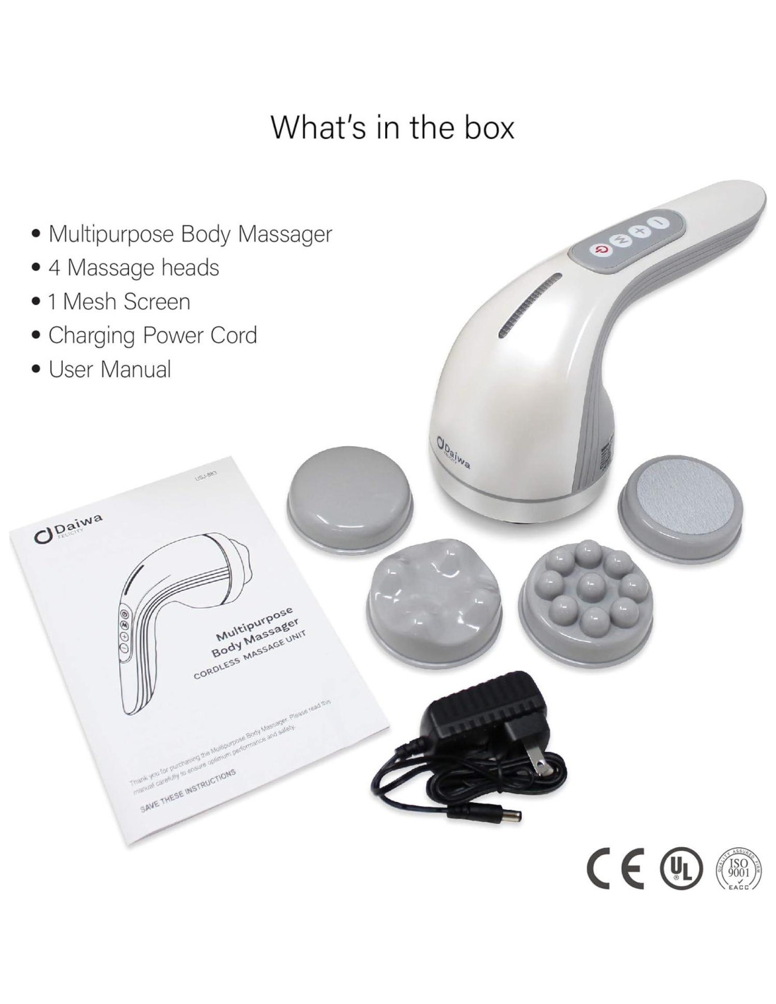 - Qué hay en la Caja: La máquina de celulitis y máquina de esculpido corporal de Daiwa Felicity viene en un acabado duradero de color Blanco Perla e incluye todo lo que necesitas: una caja reutilizable con asa, el masajeador en sí, 4 cabezales de masaje intercambiables, 1 malla de seguridad y un cable de carga. Mide 9.25 pulgadas (23,50 cm) x 6.5 pulgadas (16,51 cm) para un manejo fácil.