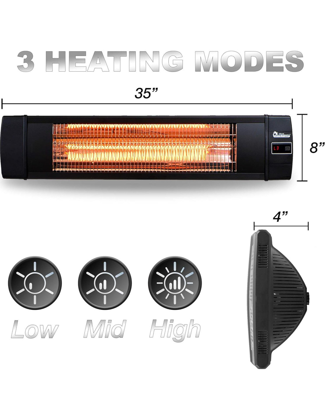 - Calentador infrarrojo de carbono para interiores y exteriores proporciona calor instantáneo y limpio con 3 configuraciones de potencia - 900W, 1200W, 1500W. Incluye soporte de montaje en pared y techo.