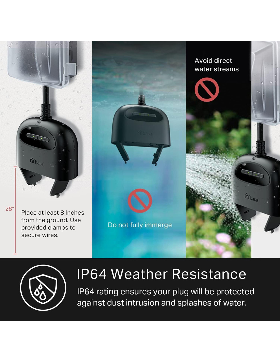 - Enchufe inteligente para exteriores con 2 tomas controladas de forma independiente, 15A (68.18) / 1875W máximo por toma. Resistente al clima IP64 con conectividad Wi-Fi hasta 300 pies (91.44 metros).