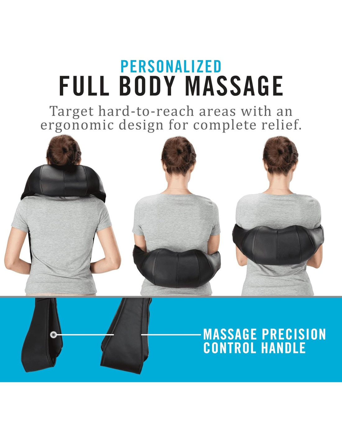 - Disfruta de terapia de masaje profesional en casa, en la oficina o en movimiento. Este masajeador compacto para el dolor de cuello y hombro viene con un adaptador de corriente y adaptador de auto para un uso flexible, además de malla transpirable y cuero suave para una comodidad y durabilidad duraderas.
