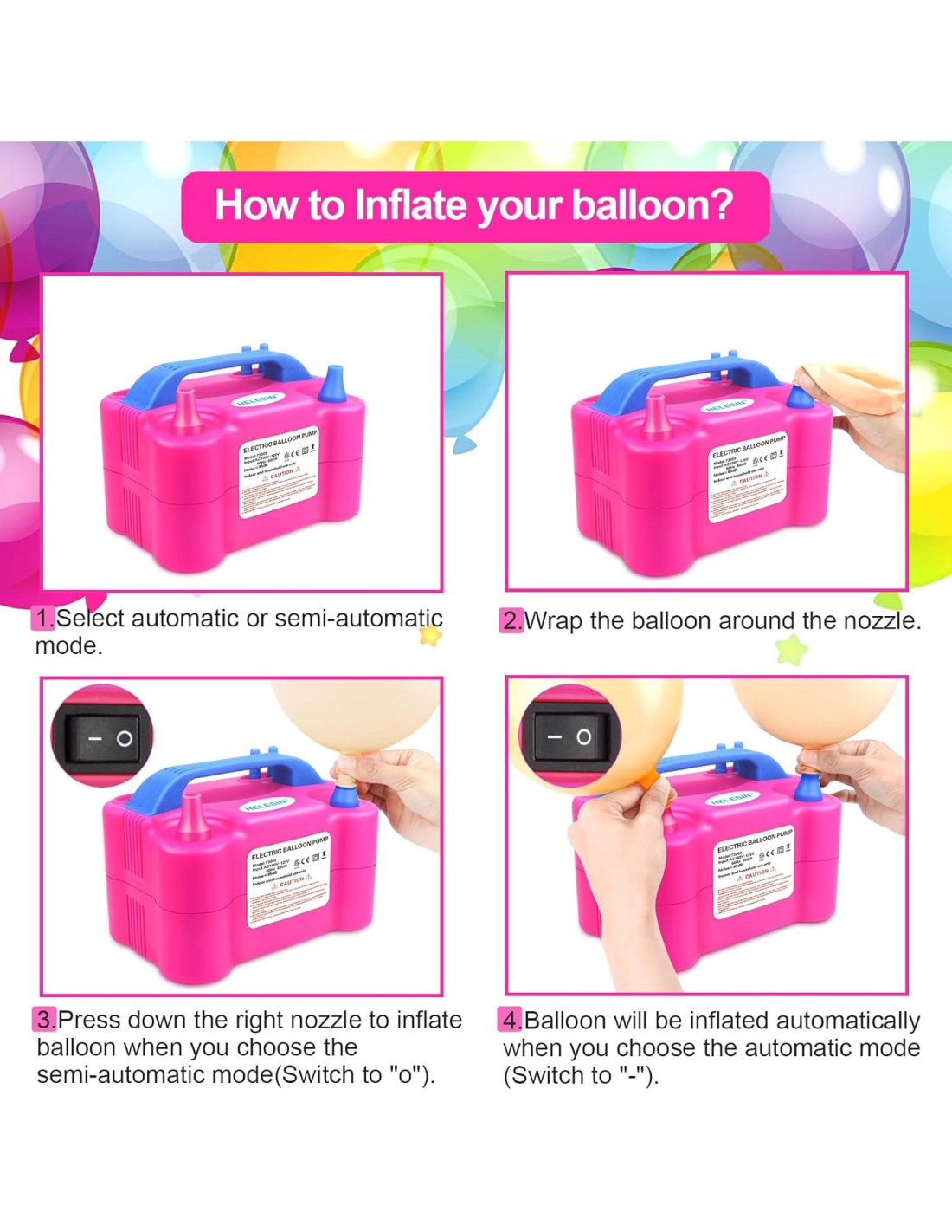 - 2 modos de operación: La bomba de globos eléctrica ofrece modos de inflado manual y automático y tiene 2 agujeros de inflado para que puedas inflar 2 globos al mismo tiempo. El inflado es rápido y estable. Y las 2 boquillas pequeñas adicionales te permiten inflar globos pequeños también.