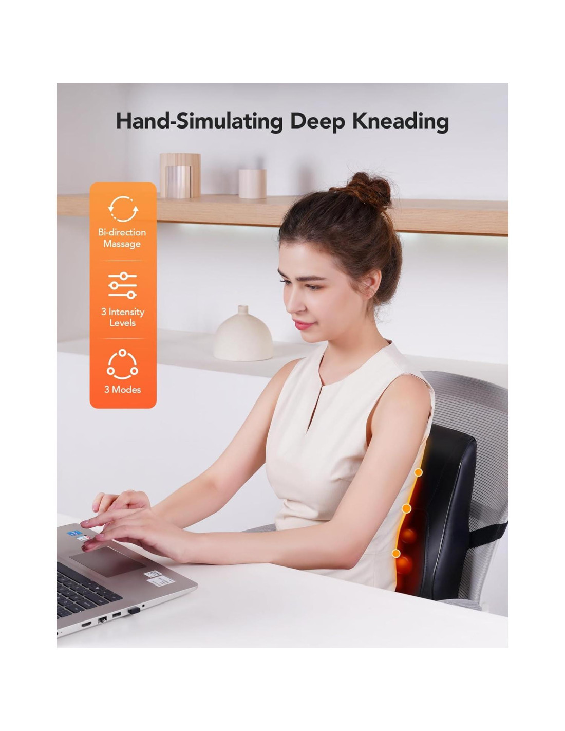 - Masajeador 3D Amasador: Los nodos giratorios 3D simulan los movimientos de amasado de dedos reales para experimentar alivio localizado. Tres niveles de intensidad ajustables abordan la tensión muscular profunda en diferentes áreas de dolor, perfecto para relajar todo el cuerpo, como el cuello, la espalda, la cintura, las piernas, los muslos, las pantorrillas, los brazos, etc.