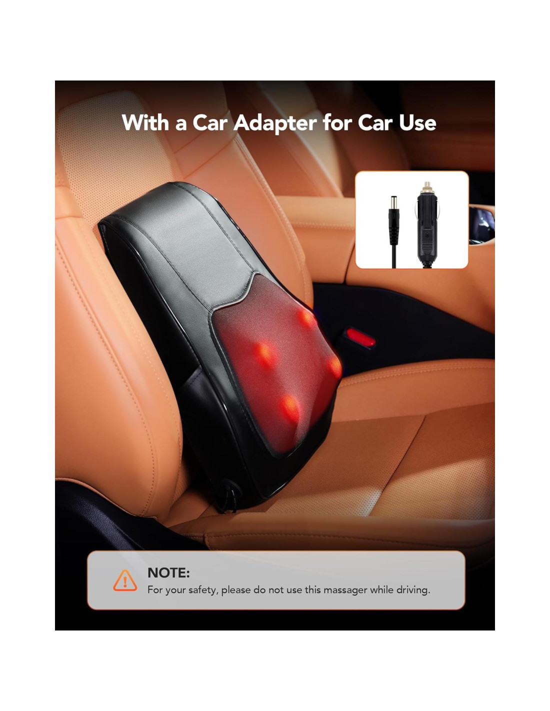 - Adaptadores de Doble Alimentación para Uso en Cualquier Lugar: Nuestro masajeador de espalda tiene un adaptador de CA (para casa/oficina) y un adaptador de coche (perfecto para viajes por carretera). Nunca te pierdas una sesión de masaje, ya sea en tu escritorio o en movimiento.