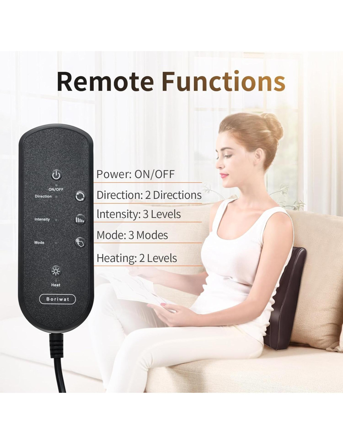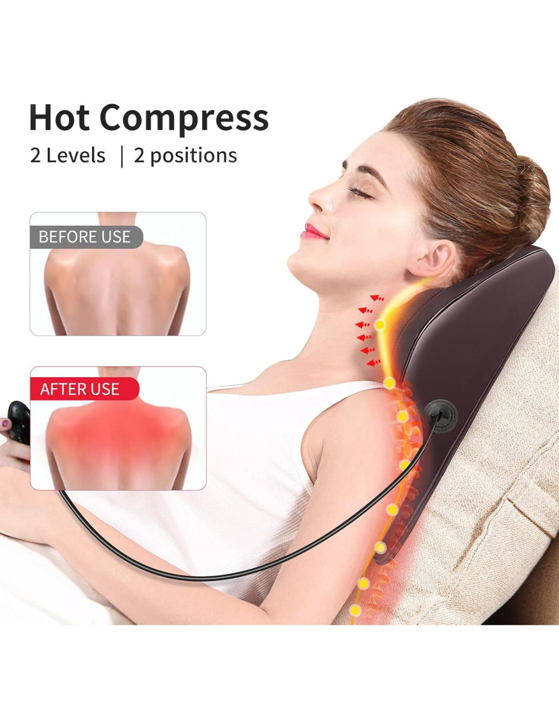 - [Masajeador de Cuello y Espalda Mejorado] Tamaño más grande: 38 x 33 cm (15 x 13 pulgadas), 15 cm (6 pulgadas) más largo que las almohadas de masaje ordinarias. Se adapta perfectamente a las curvas del cuello y la espalda para proporcionar la experiencia de masaje más cómoda. 2 posiciones de calentamiento con 2 niveles de calor. 3 intensidades ajustables, todo controlado por un conveniente control remoto.