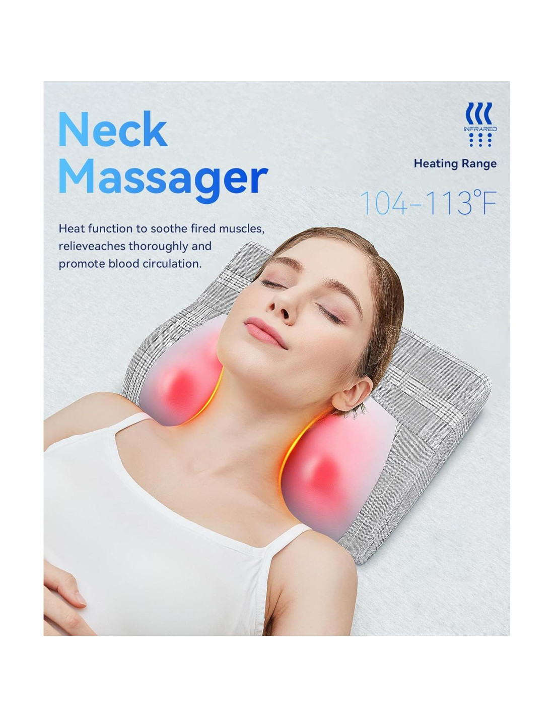 - Funda de polvo desmontable y Regalos de alta calidad: El masajeador de cuello de espalda adopta un diseño clásico de almohada de cuero PU a cuadros en blanco y negro, se ve simple y generoso. La función de protección contra sobrecalentamiento también garantiza su seguridad durante el uso. Se apaga automáticamente después de 15 minutos para prevenir el uso excesivo.