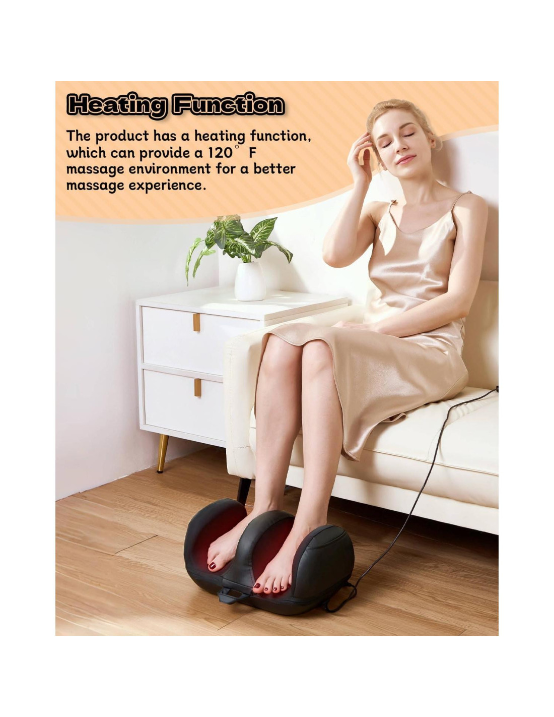 - Función de Calor: Masajeador de pies con calor, 120F (49C) para un masaje cómodo incluso en clima frío. La función de calefacción se puede encender y apagar mediante el controlador con cable, el tiempo máximo de funcionamiento del masajeador es de 90 minutos cuando la función de calefacción está activada