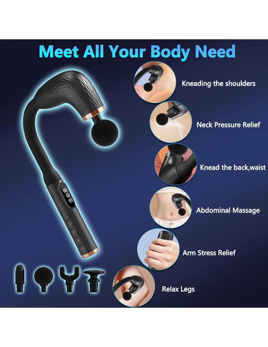 - Mango de Extensión y Diseño Ergonómico Nuestra pistola de masaje cuenta con un mango alargado fácil de agarrar con una curva ergonómica de 120 que te permite alcanzar y masajear profundamente áreas de difícil acceso como los hombros, cuello, parte baja de la espalda, espalda y pies, ayudándote a aliviar rápidamente el dolor post-entrenamiento y relajarte efectivamente.