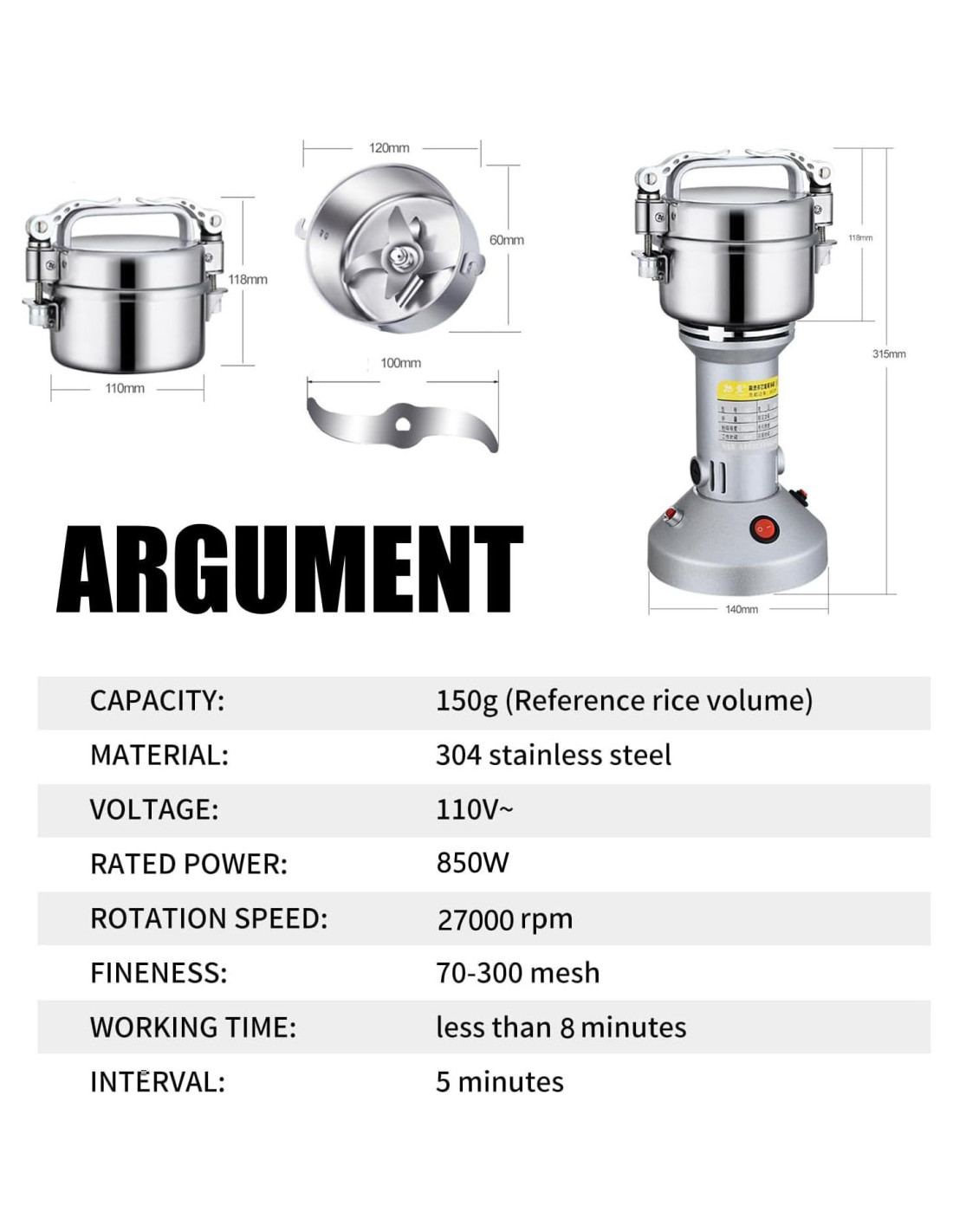 - Molino de Granos de Alta Eficiencia: Capacidad: 150g, potencia: 850w, velocidad: 27000R/min, finura de molienda: 70-300 mallas, molino de granos equipado con hoja de polvo, hoja rotativa, hoja de eliminación de polvo de tres capas de hojas, que puede ayudar a moler fácilmente una variedad de materiales secos en 30s.
