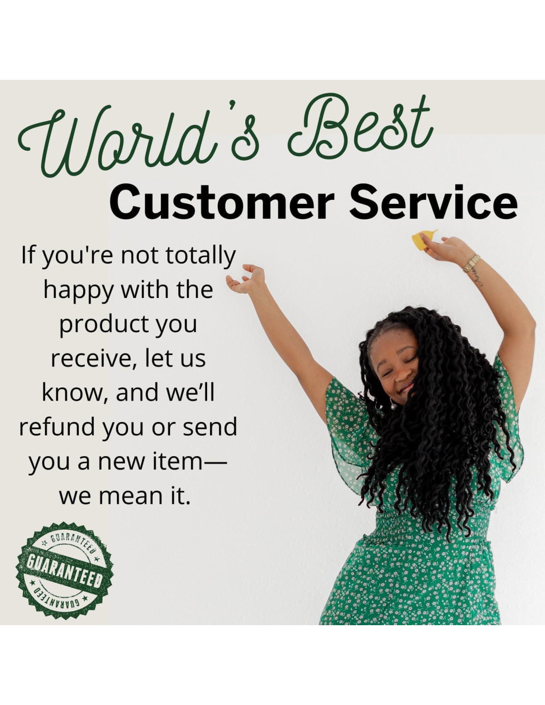 - EL MEJOR SERVICIO AL CLIENTE DEL MUNDO. Respaldamos todos nuestros productos con una Garantía de Satisfacción del 100%. Si un producto no funciona como esperabas, ¡envíanos un correo electrónico o un mensaje de texto! Te enviaremos un nuevo producto o te reembolsaremos.