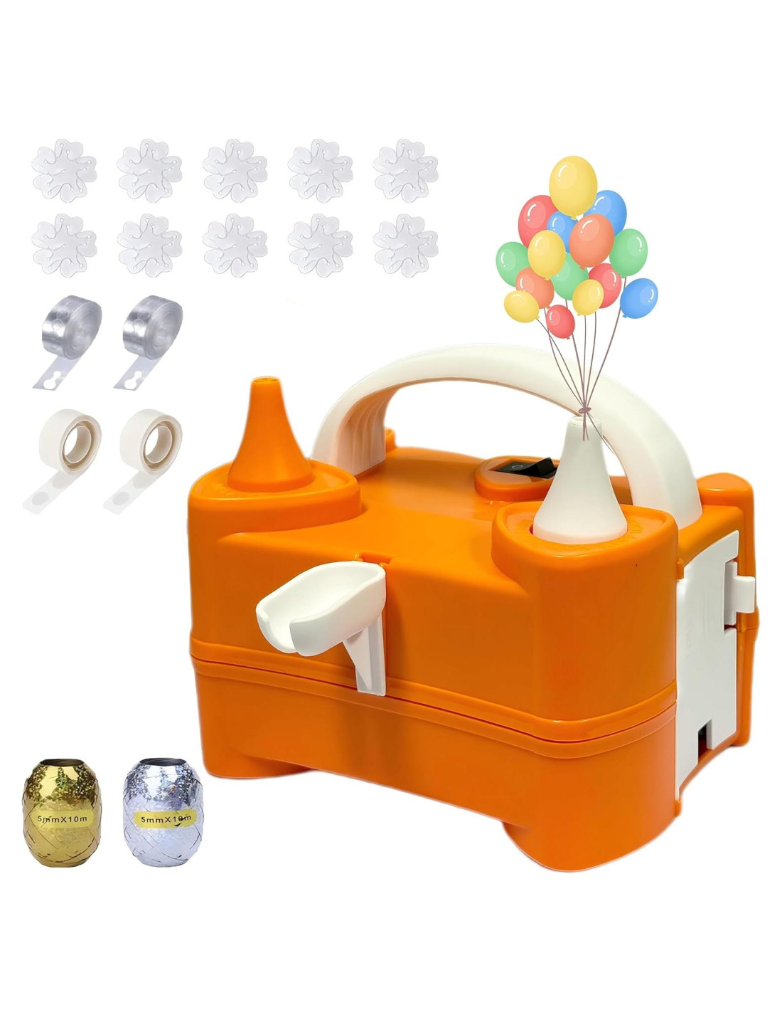 - Kit de Bomba de Globo: Además de la bomba, este kit incluye 2 cintas adhesivas, 2 cadenas de globos de 5m, 2 cintas de 10m y 10 clips para flores de globos, todo lo necesario para decoraciones con globos