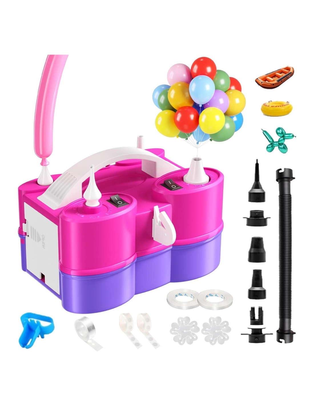 - Bomba de globos para todos los globos - Con dos motores separados, esta bomba de globo eléctrica de color púrpura y rosa viene con dos puertos de inflado distintos. Un puerto infla eficientemente globos de látex estándar, mientras que el otro está diseñado para globos largos 260Q, globos de papel de aluminio, globos de doble relleno y globos más pequeños. Ofreciendo tanto operación manual como automática, el modo de presión hacia abajo asegura un inflado controlado para evitar estallidos, mientras que el modo continuo es perfecto para inflar múltiples globos rápidamente.