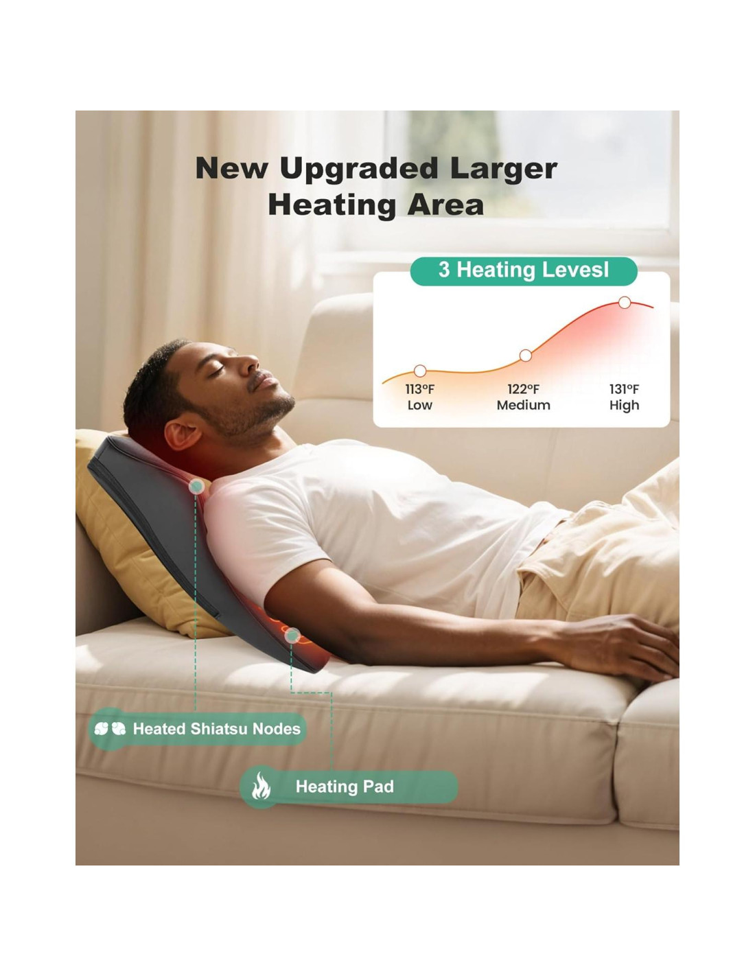 - Zonas de Calor Dual para Calor en la Espalda Completa: El masajeador de cuello Snailax con calor ahora incluye una almohadilla térmica adicional además de los nodos de masaje calefaccionados, creando dos zonas de calor para una cobertura más amplia y uniforme. Con 3 niveles de calor ajustables, el masajeador de espalda calefaccionado es perfecto para mantenerse cálido y relajado, especialmente durante los fríos días de invierno.