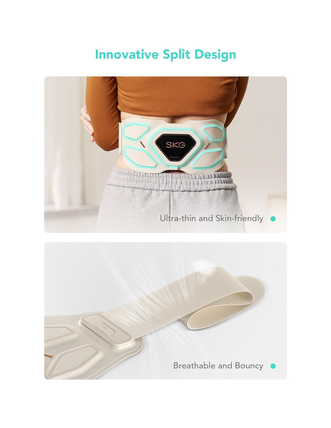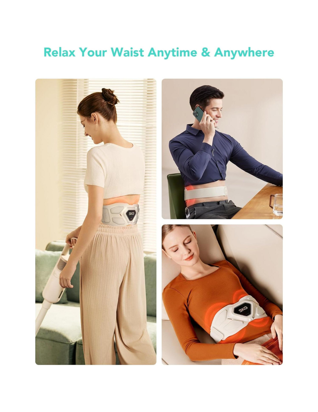 - El masajeador es ultraligero y portátil. El área del cinturón está hecha de tela de micro hilo de nylon, que es transpirable, fresca y elástica. El área funcional está hecha de silicona amigable con la piel, que es ultradelgada, duradera y fácil de limpiar. Estas características lo convierten en un regalo ideal para una mamá, un papá, o un regalo de cumpleaños para un ser querido. El masajeador de cintura ajustable SKG se adapta a cinturas de 23-45 pulgadas (58-114 cm).