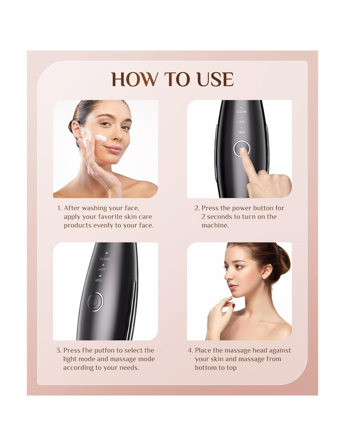 - Cómo Usar: Limpia la cara y aplica algunos productos para el cuidado de la piel antes de usar. Presiona y mantén el botón para encender y seleccionar el modo que necesitas. Sostén las piezas de sensor a ambos lados y coloca el sensor en tu piel, el dispositivo comenzará a vibrar. Se recomienda usar una o dos veces al día durante cinco a diez minutos.