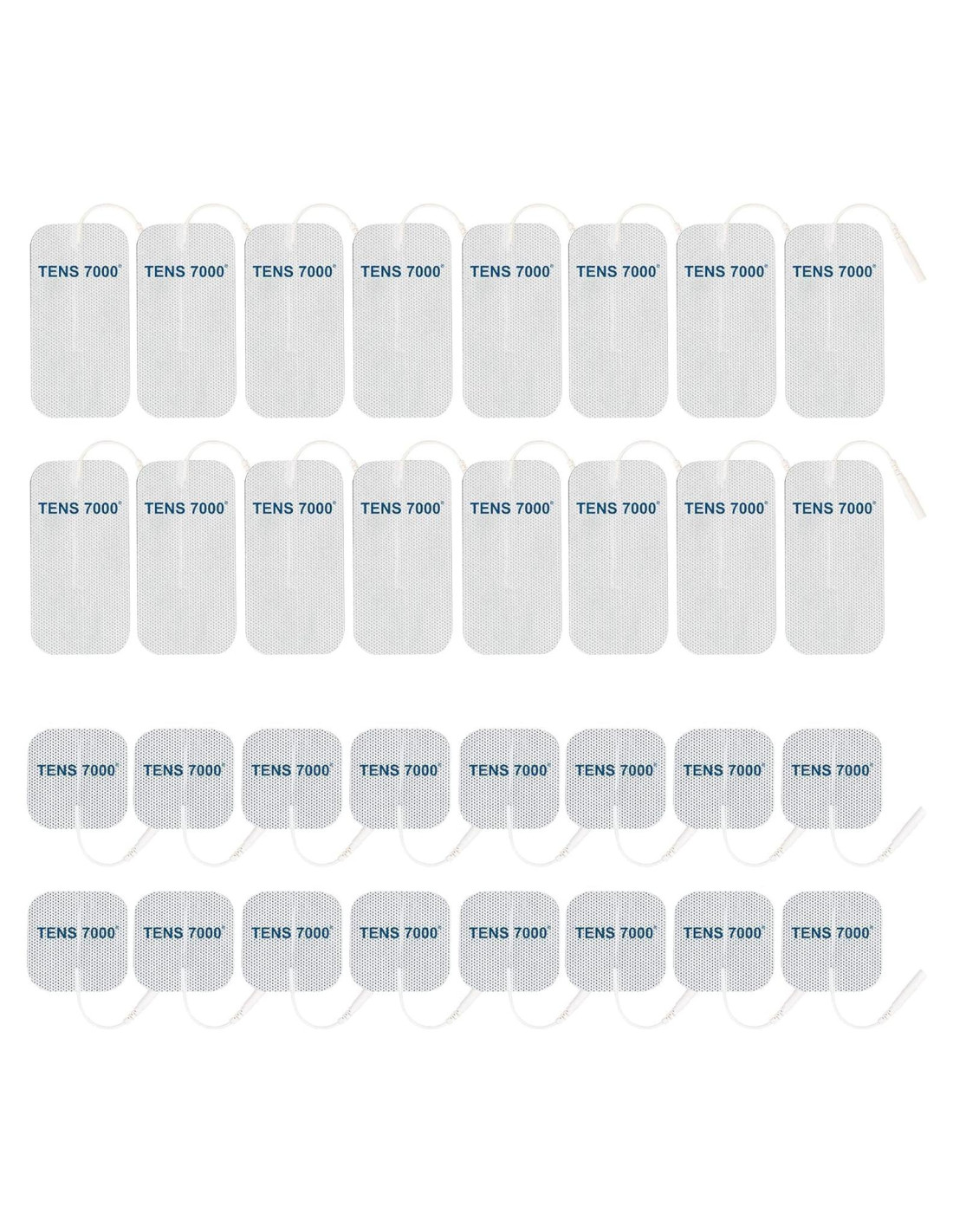 - ALMOHADILLAS DE REEMPLAZO TENS 7000. 32 unidades (16 pares) de 5.08 cm x 10.16 cm (16), 5.08 cm x 5.08 cm (16) almohadillas de electroterapia de calidad premium; almohadillas de estimulación eléctrica de grado médico con interfaz de cable de estilo pig-tail. Las almohadillas de la unidad TENS 7000 son reutilizables y distribuyen uniformemente la corriente TENS.