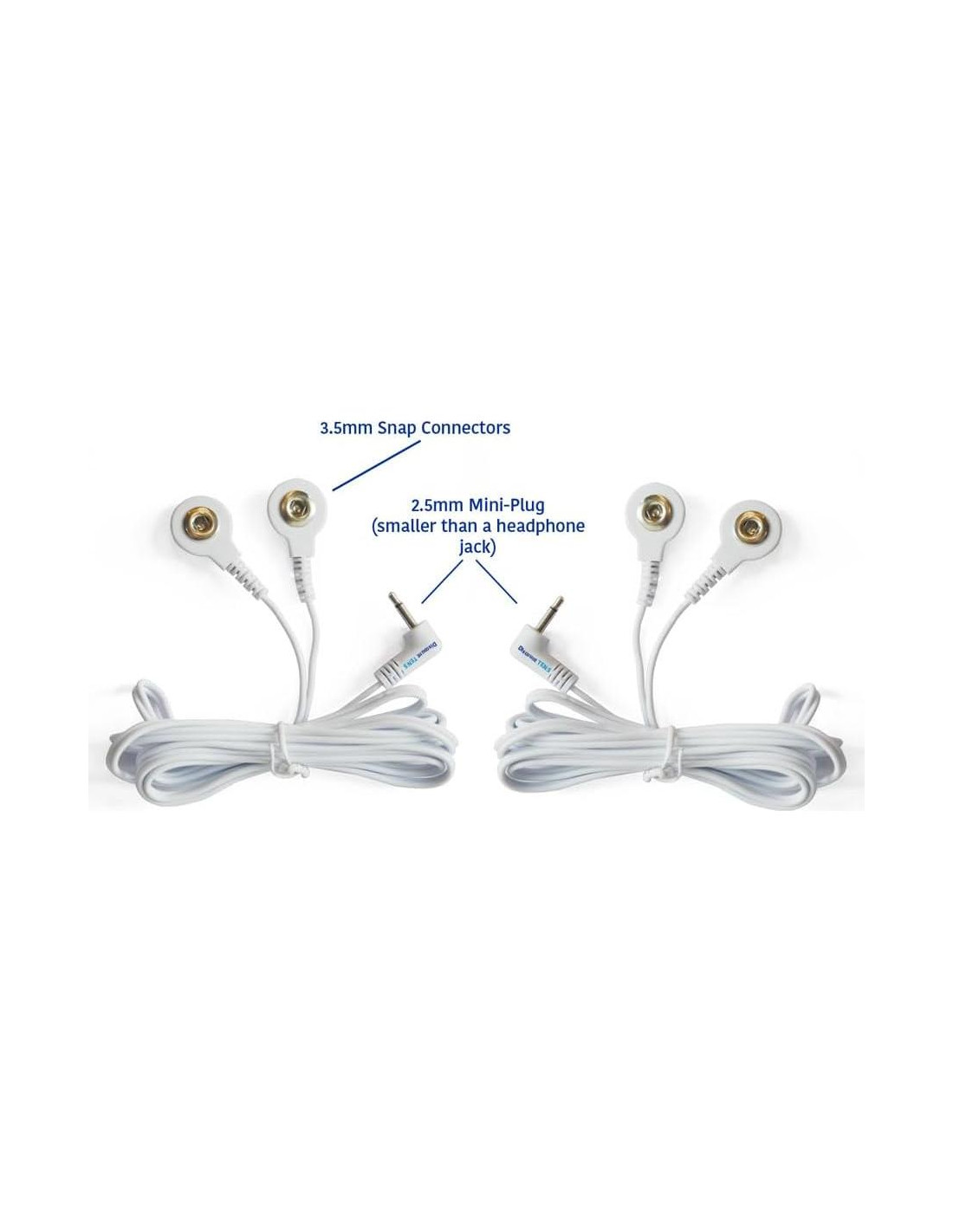 Nota: Hay tres tamaños de enchufe. Asegúrate de elegir el tamaño de enchufe correcto para tu dispositivo. Dos cables de electrodo TENS de alta calidad de la marca Descuento TENS. Estos cables duraderos utilizan cada uno el mini-enchufe de 2.5mm a dos conectores de presión de 3.5mm. Nota: Asegúrate de que tu dispositivo use el mini-enchufe de 2.5mm (más pequeño que un enchufe de auriculares). Si tu dispositivo tiene el puerto estándar de 3.5mm (tamaño de conector de auriculares), también los ofrecemos en Amazon. Usado para almohadillas de electrodo que aceptan el conector de presión estándar de la industria de 3.5mm.